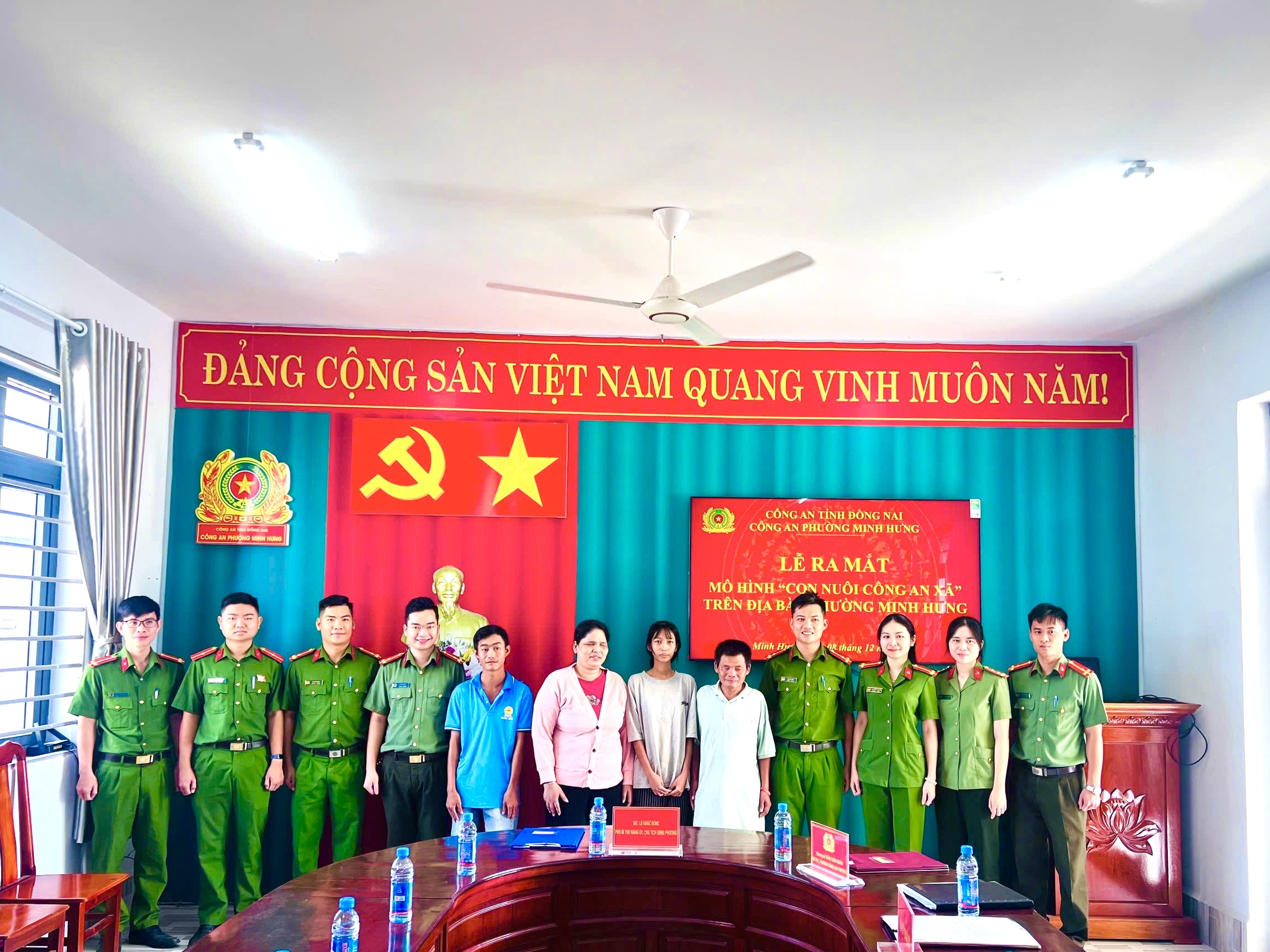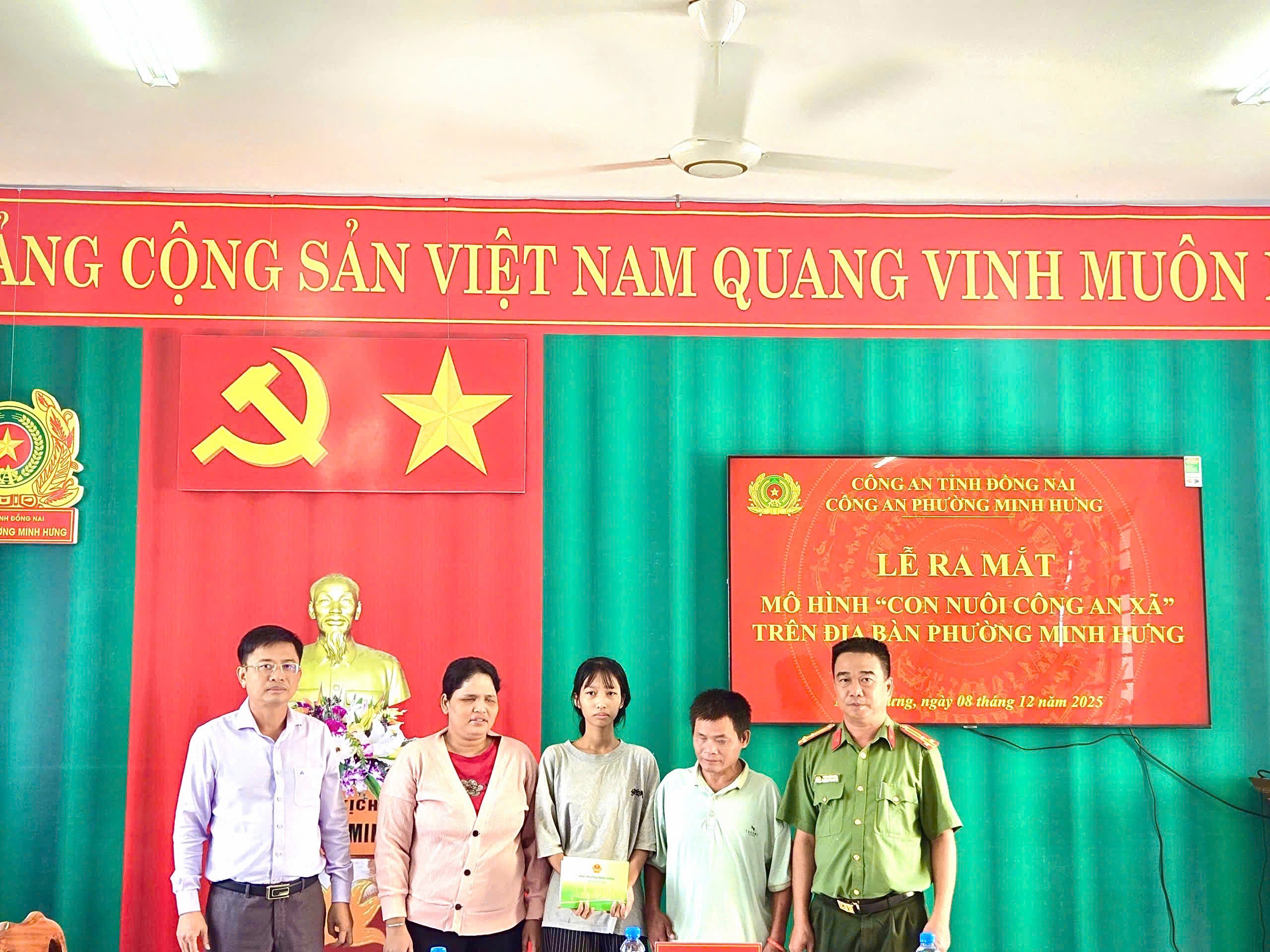 Tại buổi lễ, Công an phường Minh Hưng đã nhận em Ngô Thị Bích Thảo (sinh năm 2008, học sinh lớp 12A3 Trường THCS & THPT Minh Hưng) làm con nuôi. Em Thảo là học sinh có hoàn cảnh đặc biệt khó khăn khi cả cha và mẹ đều khiếm thị, cuộc sống gia đình phụ thuộc vào nguồn thu nhập bấp bênh.