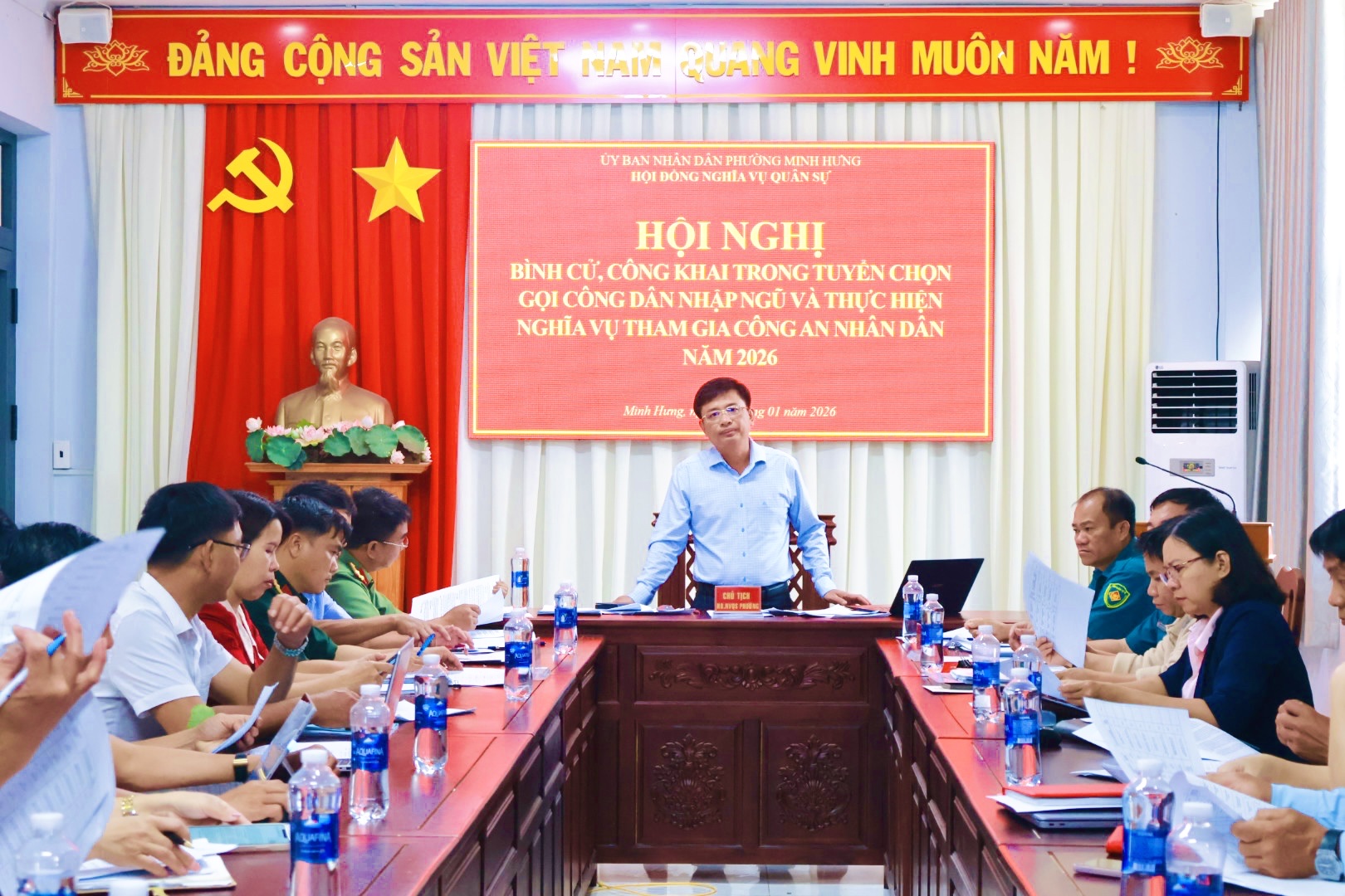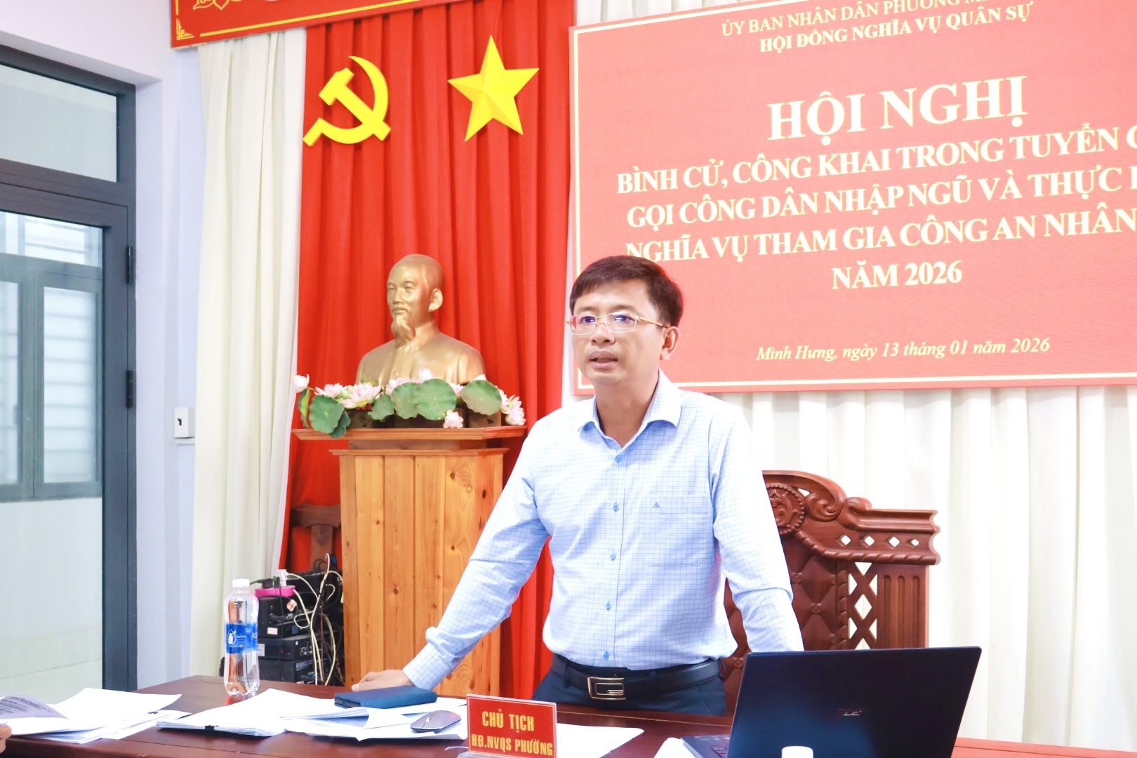Phát biểu kết luận hội nghị, đồng chí Lê Khắc Đồng - Chủ tịch UBND phường, Chủ tịch Hội đồng NVQS phường yêu cầu các thành viên Hội đồng Nghĩa vụ quân sự phường và các khu phố tiếp tục thực hiện nghiêm túc, đồng bộ các bước trong quy trình tuyển chọn, gọi công dân nhập ngũ; tăng cường công tác tuyên truyền, quản lý nguồn thanh niên, bảo đảm công bằng, minh bạch, đúng luật, góp phần hoàn thành thắng lợi chỉ tiêu giao quân năm 2026.