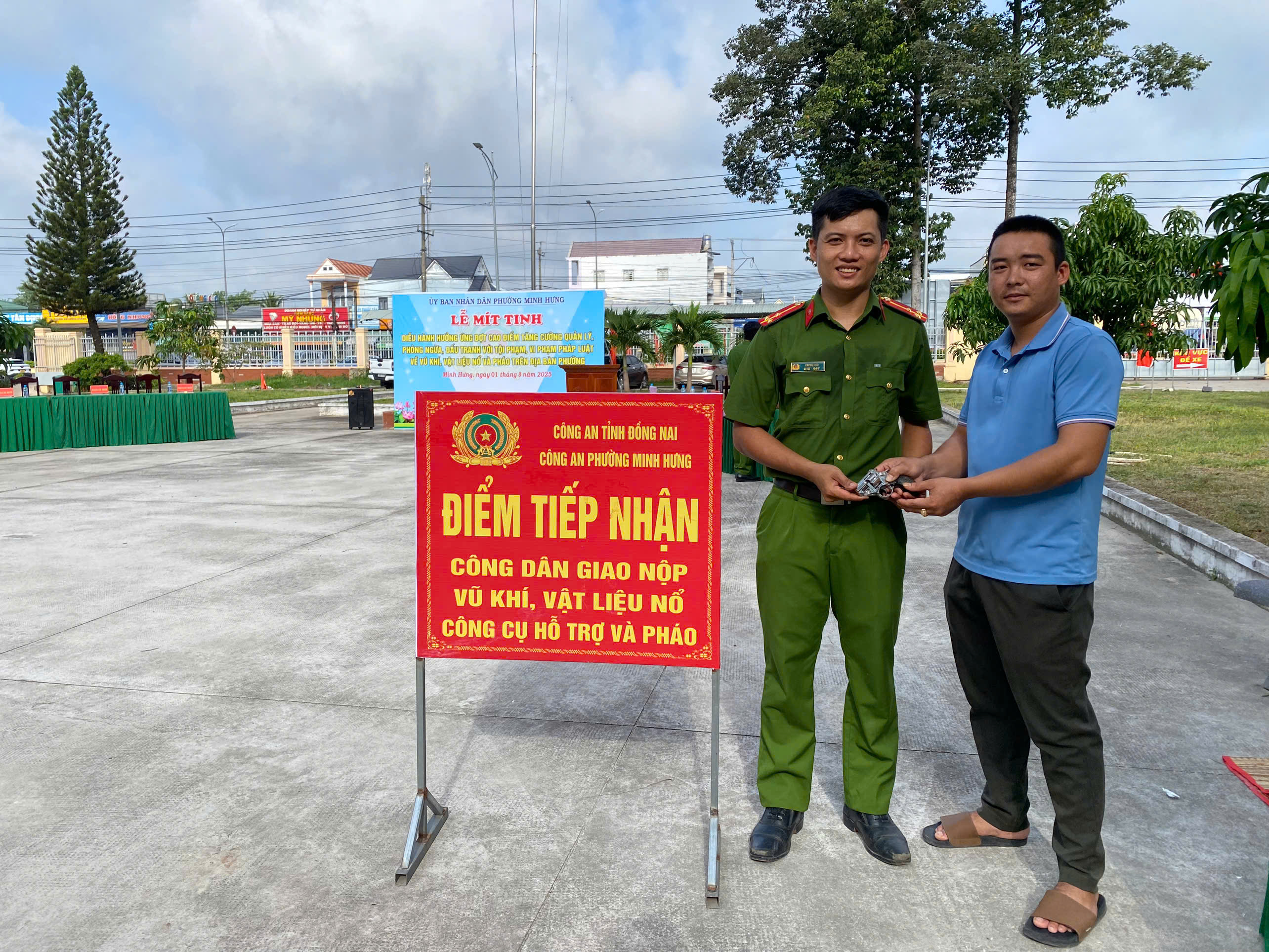 Cũng trong lễ mittinh diễu hành, nhân dân trên địa bàn phường đã đến điểm tiếp nhận giao nộp 17 vũ khí thô sơ các loại cho Công an phường Minh Hưng. Công an phường cũng đã trao tặng 17 phần quà (nón bảo hiểm) cho 17 trường hợp công dân đến giao nộp VK, VLN, CCHT.