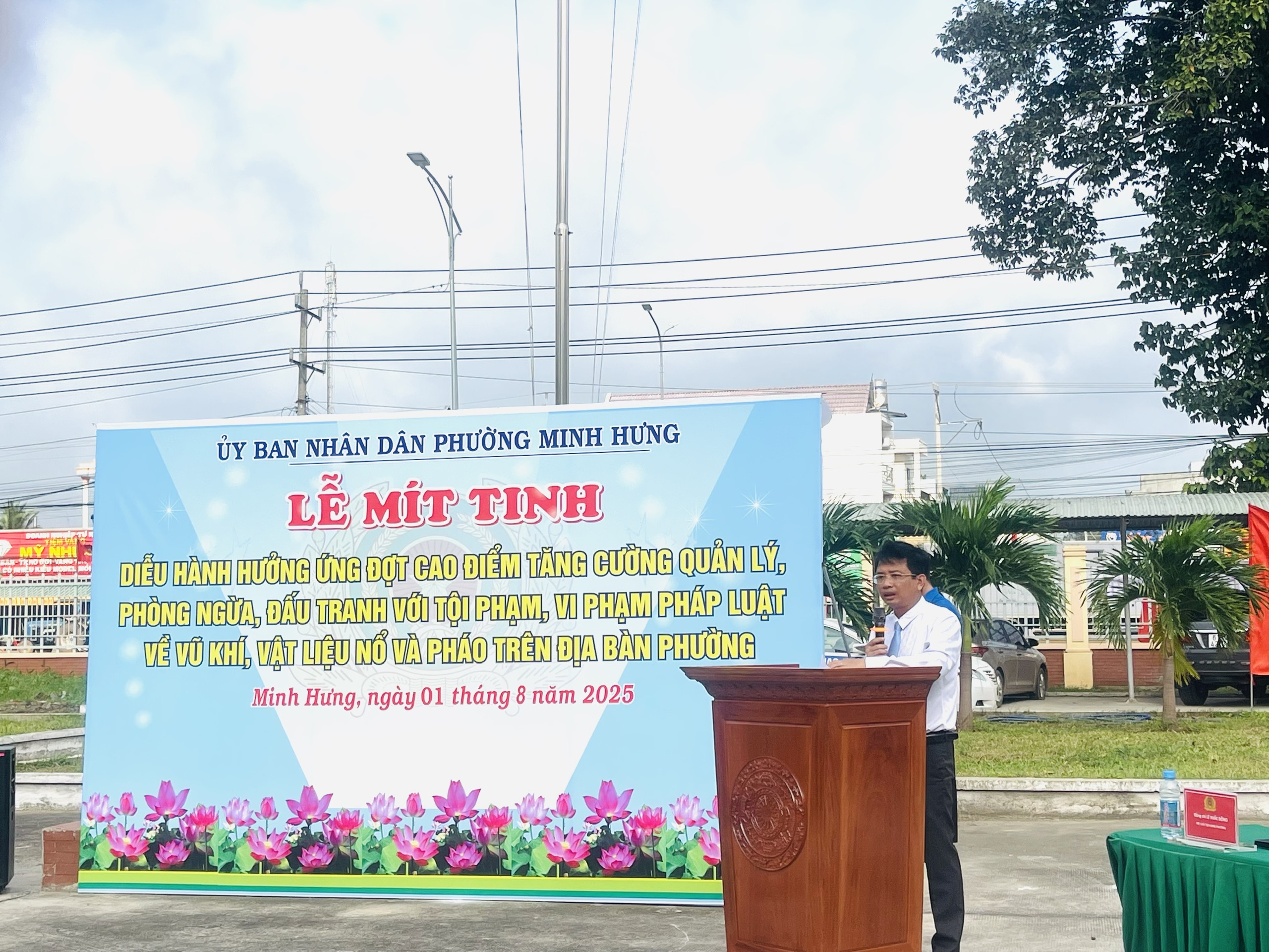 Tại buổi mittinh, thượng tá Trần Tuấn Nghĩa – Trưởng Công an phường Minh Hưng đã triển khai lộ trình đoàn diễu hành từ UBND phường đến các trục đường chính trên địa bàn phường để tuyên truyền đến người dân trên địa bàn biết, hiểu rõ và tự giác chấp hành đồng thời chủ động phối hợp với cơ quan chức năng trong phòng, chống tội phạm, vi phạm pháp luật về quản lý, sử dụng VK, VLN, CCHT và pháo, tạo sự chuyển biến tích cực trong nhận thức, ý thức của quần chúng nhân dân và góp phần bảo đảm an ninh trật tự trên địa bàn.