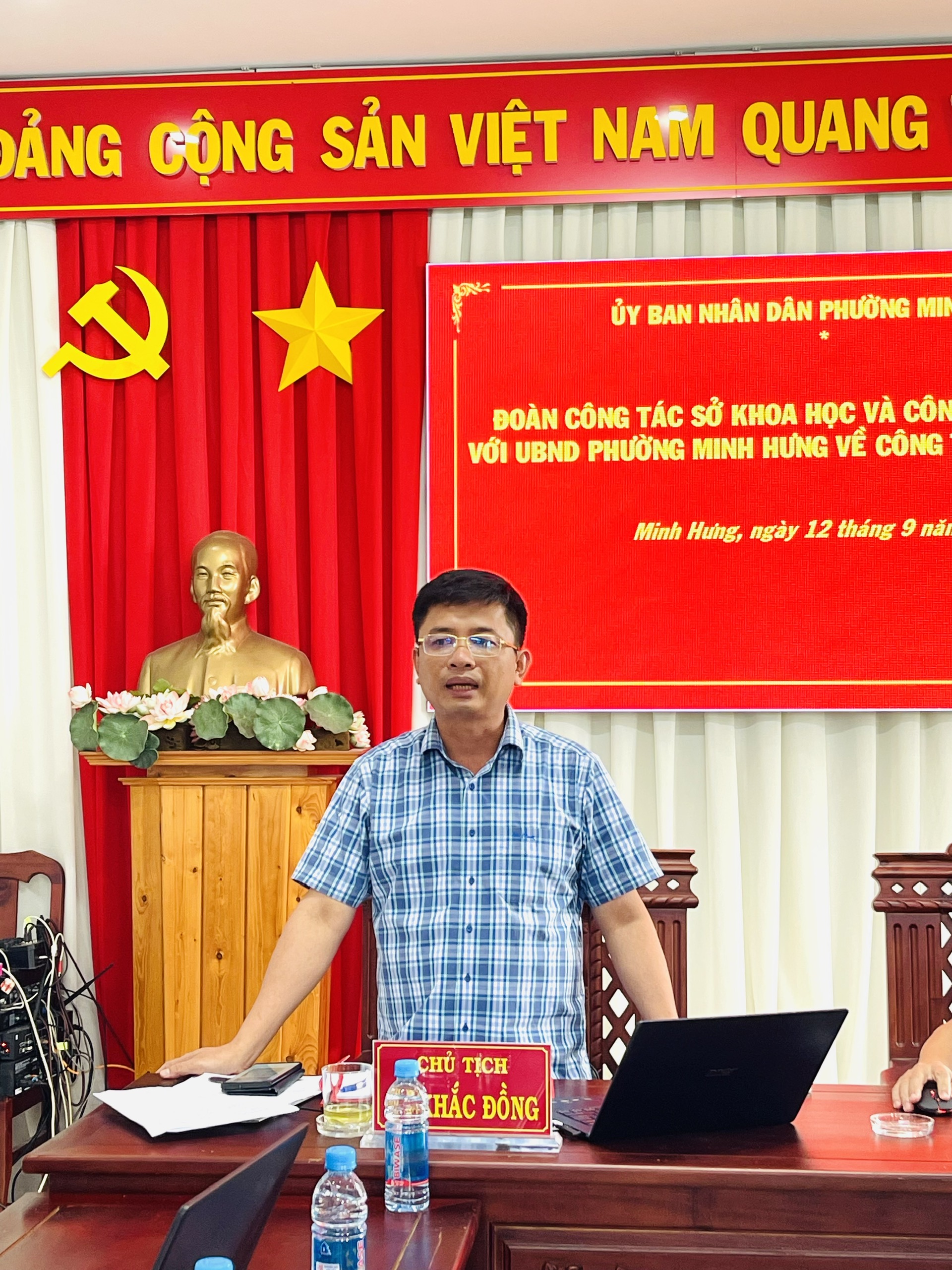 Ông Lê Khắc Đồng - Chủ tịch UBND phường gửi lời cảm ơn sâu sắc đến đoàn công tác của Sở Khoa học và Công nghệ đã dành thời gian về kiểm tra, đánh giá công tác chuyển đổi số trên địa bàn phường. Sự quan tâm và hỗ trợ của đoàn không chỉ là nguồn động viên to lớn đối với chính quyền địa phương mà còn góp phần thúc đẩy quá trình chuyển đổi số diễn ra hiệu quả, đồng bộ và bền vững. Ông mong muốn trong thời gian tới, phường Minh Hưng sẽ tiếp tục nhận được sự đồng hành, hướng dẫn từ Sở KH&CN để từng bước nâng cao năng lực số, phục vụ tốt hơn cho người dân và doanh nghiệp trên địa bàn phường.