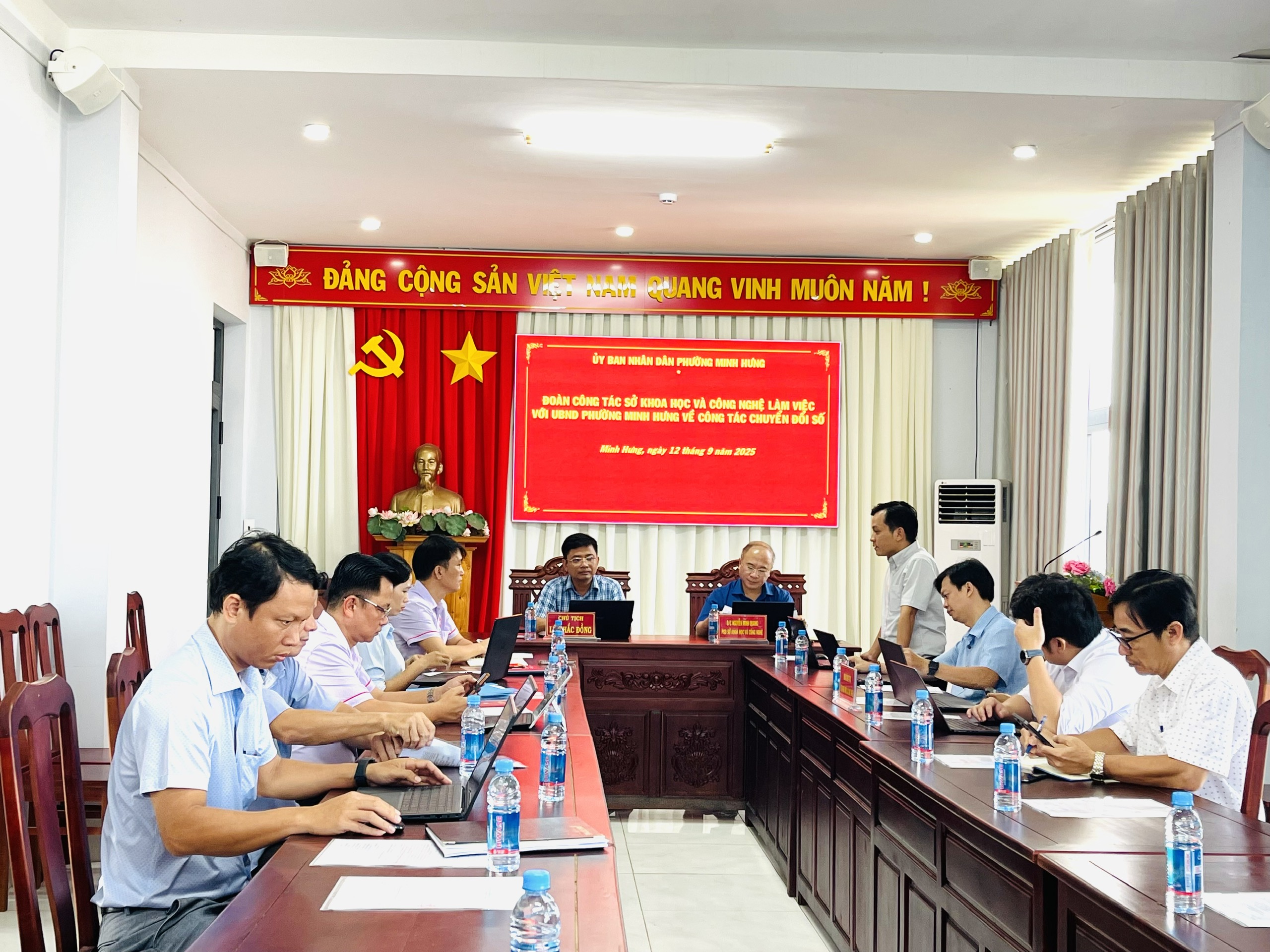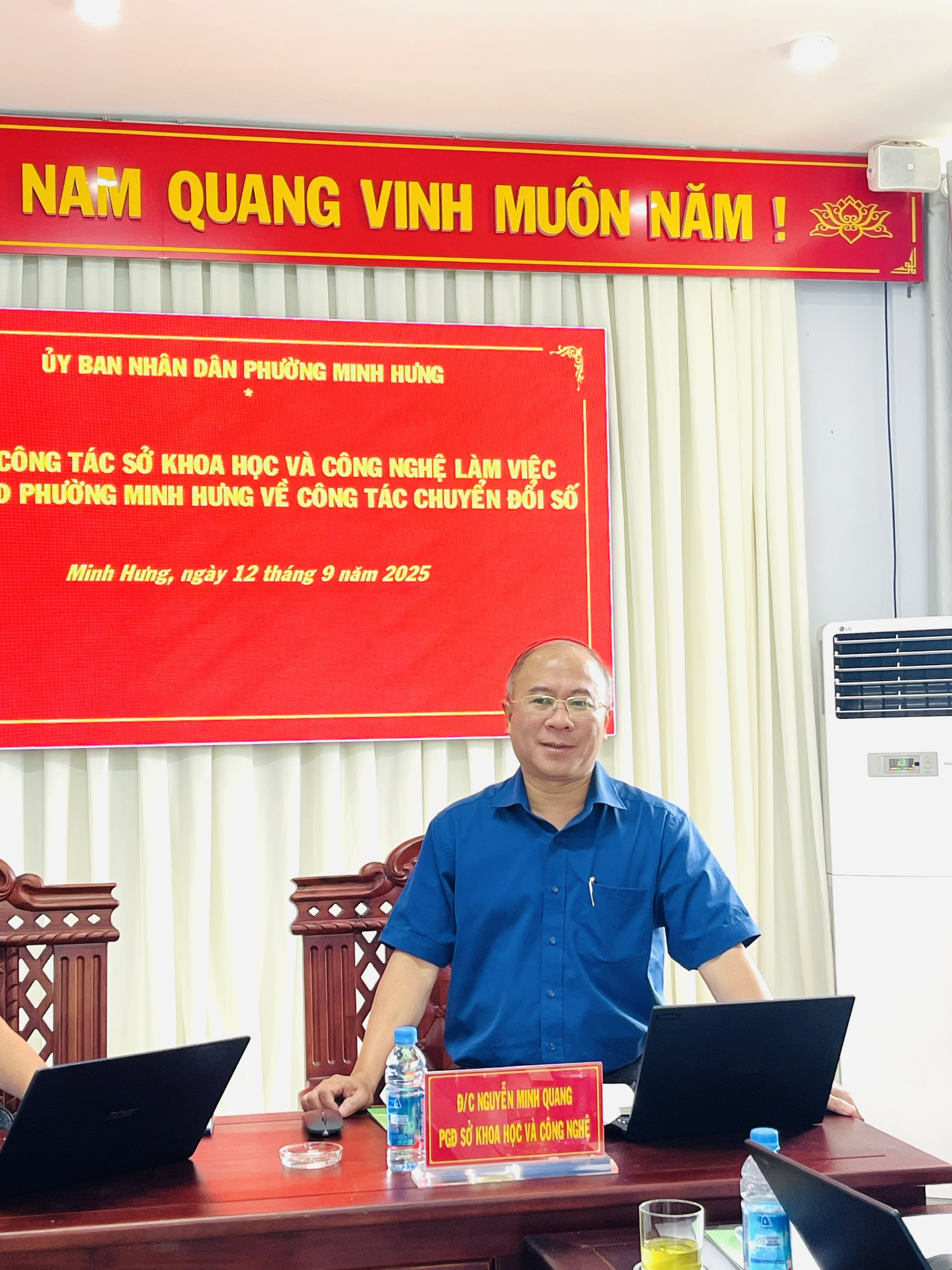 Sau khi nghe lãnh đạo phường, các phòng chuyên môn, trung tâm phường báo cáo với đoàn về kết quả thực hiện nhiệm vụ chuyển đổi số, những khó khăn, vướng mắc của địa phương về việc giải quyết các thủ tục hành chính, việc số hóa hồ sơ, ...Phát biểu tại buổi làm việc, ông Nguyễn Minh Quang - Phó Giám đốc Sở Khoa học và Công nghệ ghi nhận và đánh giá cao những cố gắng, nỗ lực của phường Minh Hưng trong công tác chuyển đổi số sau khi thực hiện chính quyền địa phương 2 cấp. Sau khi thăm Trung tâm Phục vụ hành chính công và lắng nghe địa phương báo cáo tình hình thực hiện nhiệm vụ, Ông đã chỉ đạo các bộ phận chuyên môn của Sở Khoa học và Công nghệ kịp thời giải quyết những ý kiến, kiến nghị, tháo gỡ những khó khăn, vướng mắc trong công tác chuyển đổi số.... Ông Quang đề nghị trong thời gian tới, phường Minh Hưng tiếp tục thực hiện tốt nhiệm vụ trong công tác chuyển đổi số, trong quá trình xử lý công việc có khó khăn, vướng mắc kịp thời báo cáo để có hướng xử lý kịp thời, không làm ảnh hưởng đến việc phục vụ người dân, doanh nghiệp và tiến độ xử lý công việc trên môi trường mạng.