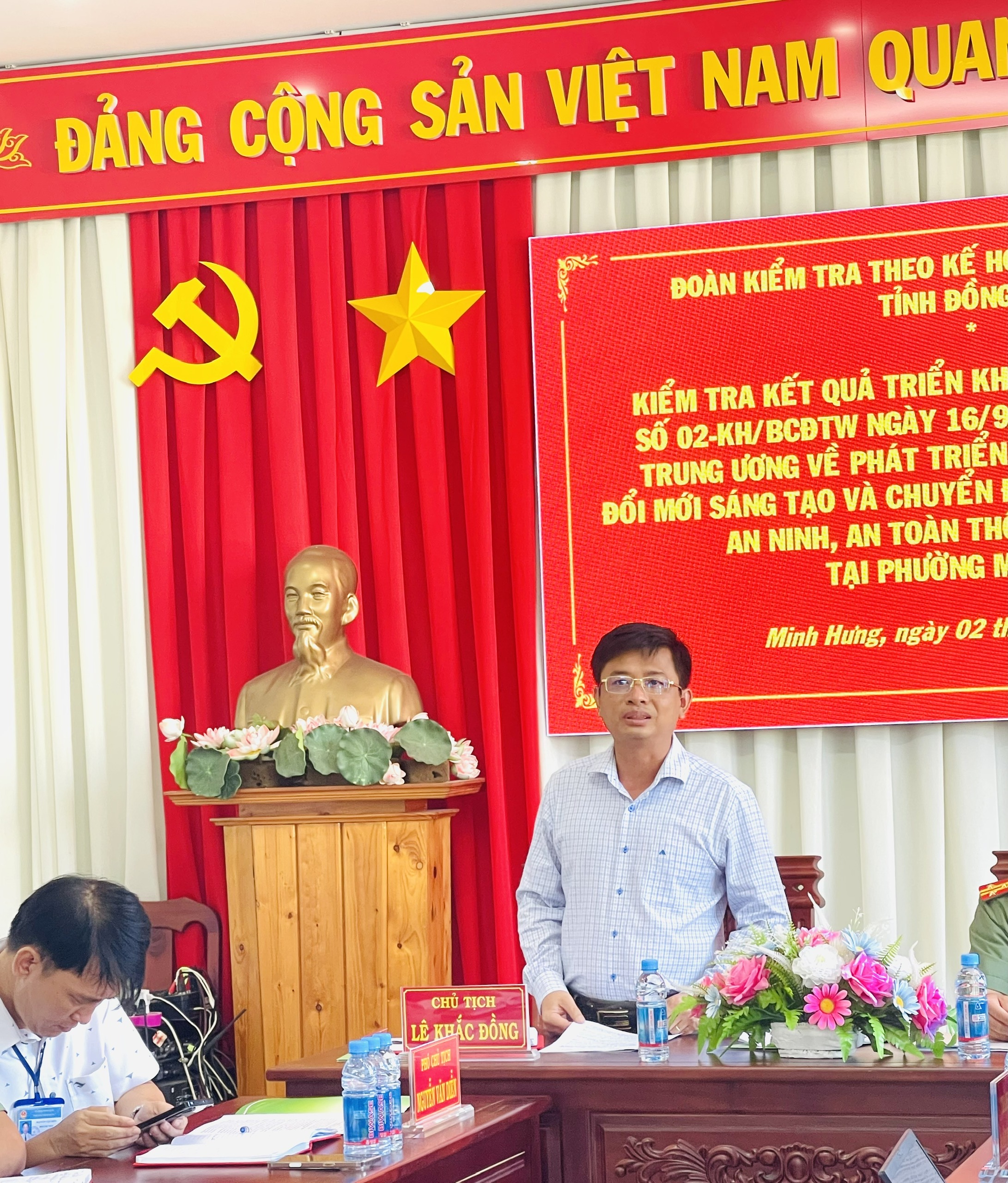 Phát biểu kết luận, Thượng tá Trương Minh Trung - Trưởng đoàn kiểm tra đề nghị phường Minh Hưng tiếp tục nâng cao năng lực cán bộ chuyên trách CNTT; Tăng cường tuyên truyền, nâng cao nhận thức về an ninh mạng cho cán bộ, công chức, viên chức và người dân; Xây dựng phương án dự phòng, ứng phó kịp thời với các tình huống rủi ro; Thực hiện nghiêm các quy định về bảo vệ bí mật nhà nước.