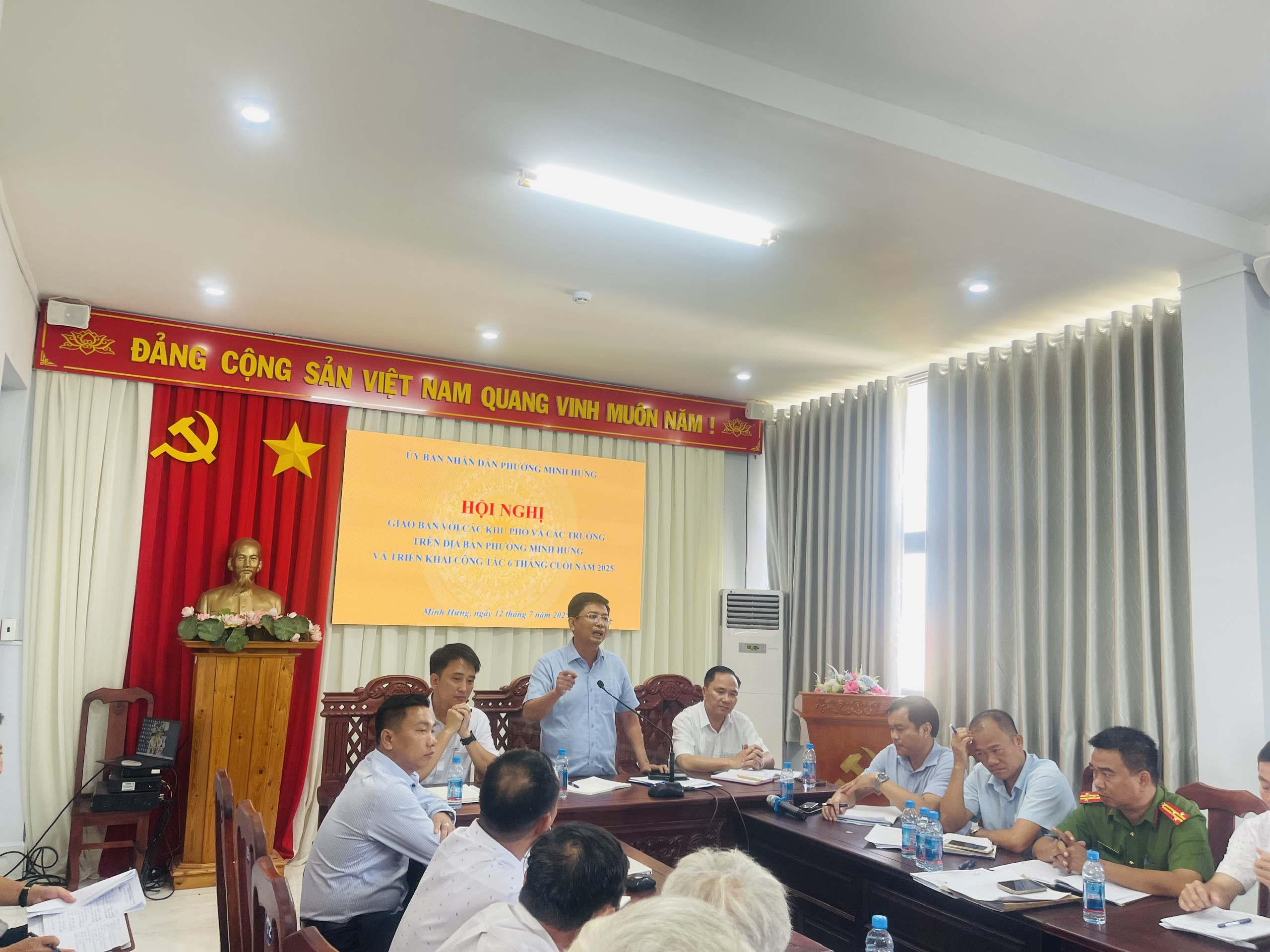 Phát biểu chỉ đạo hội nghị, ông Lê Khắc Đồng – Chủ tịch UBND phường ghi nhận những ý kiến đóng góp của BGH các trường, đồng thời chỉ đạo Hiệu trưởng các trường tiếp tục rà soát lại số lượng giáo viên, thống kê lại cơ sở vật chất, số học sinh độ tuổi đi học, vận động các em đến lớp, chủ động chuẩn bị các điều kiện cần thiết như: vệ sinh trường lớp, khuôn viên trường, các phòng chức năng phục vụ học tập đảm bảo khang trang, sạch sẽ để đón các em đến trường học tập. Chủ tịch UBND phường ghi nhận và cảm ơn tập đoàn Hoàng Cát đã tạo điều kiện cho địa phương mượn 10 phòng học để giúp giải quyết thiếu phòng học ở 2 trường Tiểu học Minh Hưng A và Tiểu học Minh Hưng B. Ông đề nghị Bí thư và Trưởng các Khu phố phối kết hợp với nhà trường tuyên truyền vận động con em trong độ tuổi đến trường, thực hiện rà soát, phân luồng cho các em học tập đúng tuyến, tạo điều kiện thuận lợi nhất cho phụ huynh và học sinh cũng như công tác quản lý của các trường góp phần nâng cao chất lượng giáo dục năm học mới 2025 - 2026 và những năm học tiếp theo.
