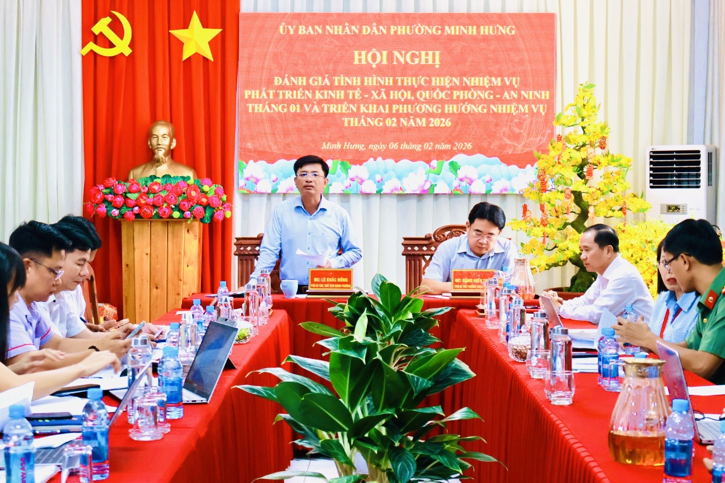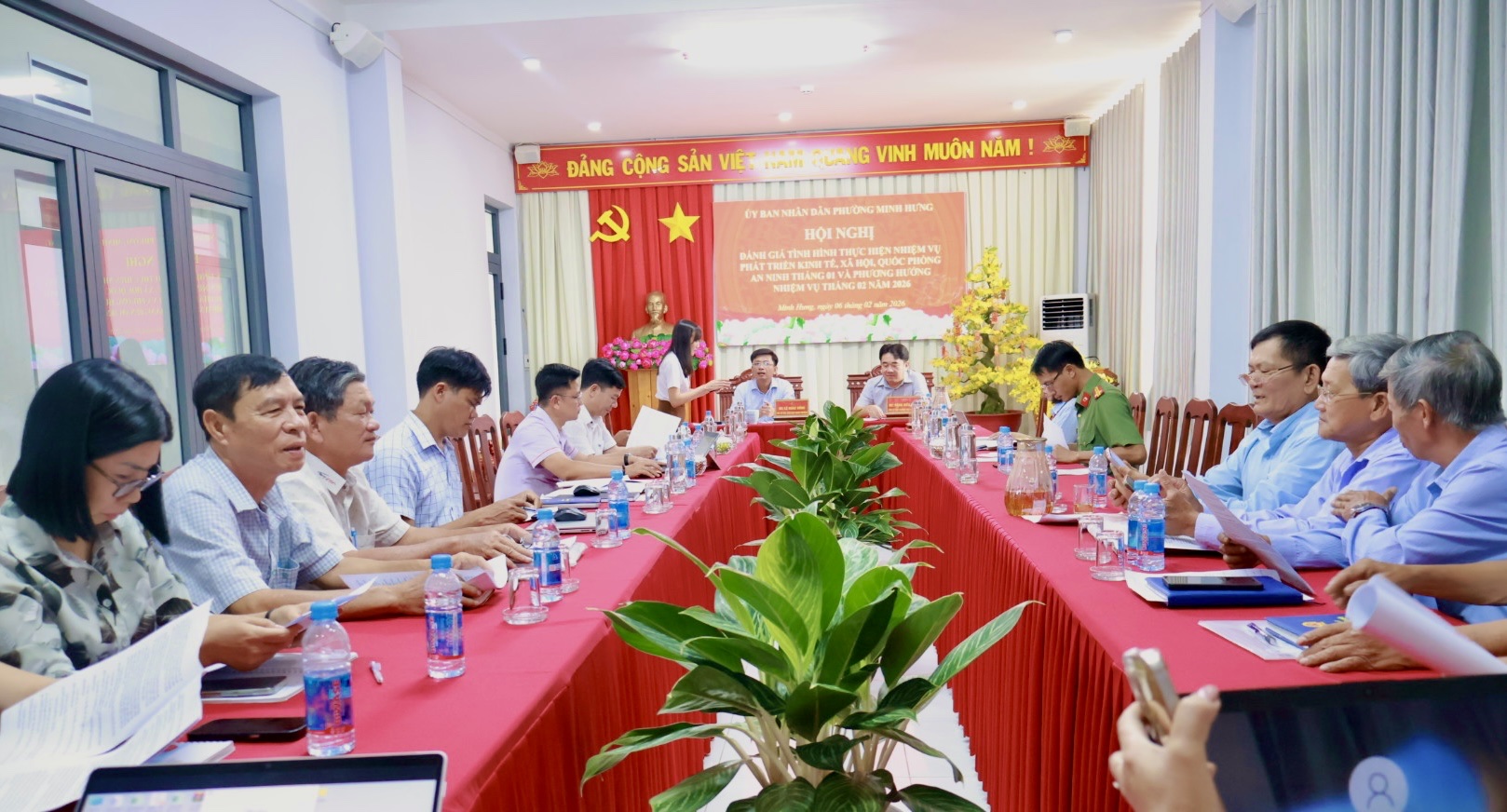 Trong tháng 02/2026, UBND phường Minh Hưng tiếp tục bám sát chương trình công tác năm 2026 và các nghị quyết của cấp trên, tập trung chỉ đạo thực hiện các giải pháp phát triển kinh tế - xã hội; quản lý chặt chẽ thu, chi ngân sách; đôn đốc tiến độ các công trình, dự án trọng điểm, đặc biệt là dự án đường phía Tây Quốc lộ 13. Đồng thời, tăng cường công tác bình ổn thị trường, bảo đảm an toàn vệ sinh thực phẩm; chăm lo đời sống Nhân dân và các đối tượng chính sách; siết chặt quản lý nhà nước về đất đai, xây dựng, môi trường; đẩy mạnh cải cách hành chính gắn với chuyển đổi số, nâng cao kỷ luật, kỷ cương hành chính; chuẩn bị tốt các nội dung phục vụ bầu cử đại biểu Quốc hội khóa XVI và HĐND các cấp nhiệm kỳ 2026 - 2031; giữ vững quốc phòng - an ninh, trật tự an toàn xã hội trên địa bàn.