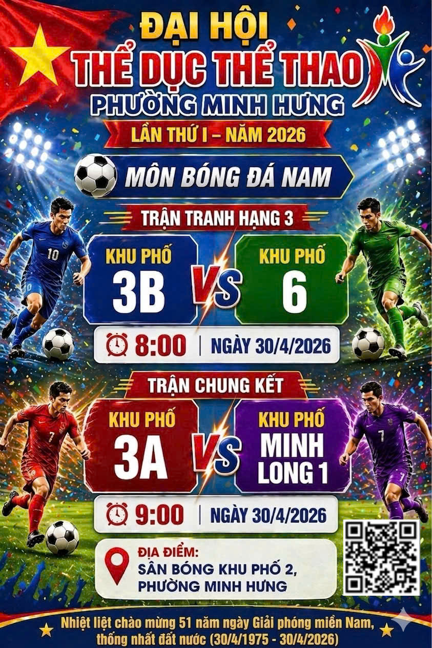 Ban tổ chức Đại hội Thể dục thể thao phường Minh Hưng lần thứ I, năm 2026 thông báo thời gian, địa điểm thi đấu trận tranh hạng Ba và trận Chung kết môn bóng đá nam trong khuôn khổ Đại hội thể dục thể thao phường.