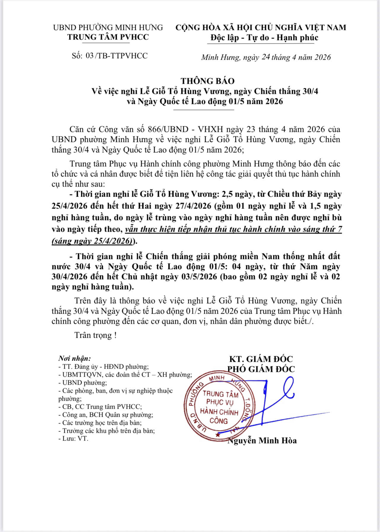 Trung tâm Phục vụ hành chính công phường Minh Hưng thông báo về việc nghỉ lễ Giỗ tổ Hùng Vương, Ngày Giải phóng miền Nam thống nhất đất nước (30/4) và Quốc tế lao động (01/5) năm 2026.