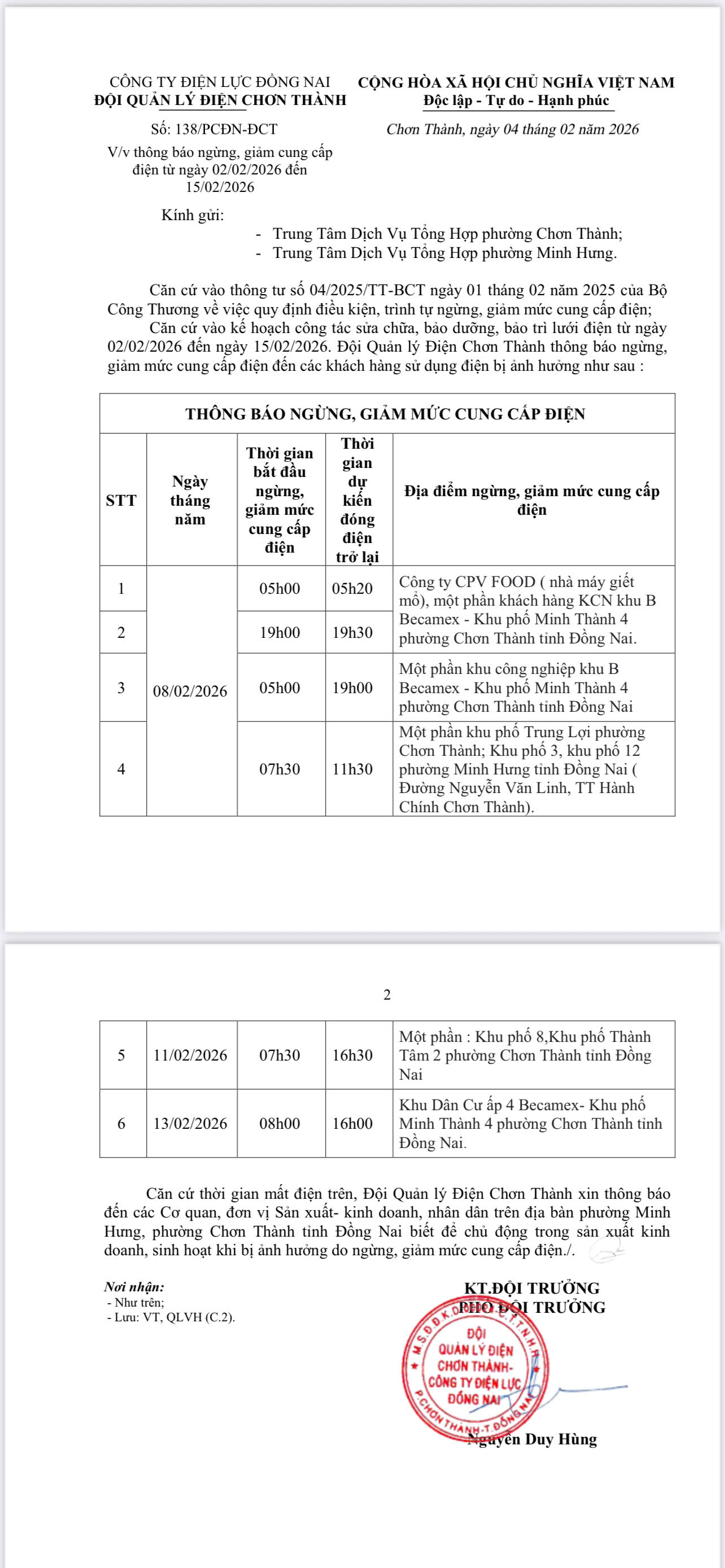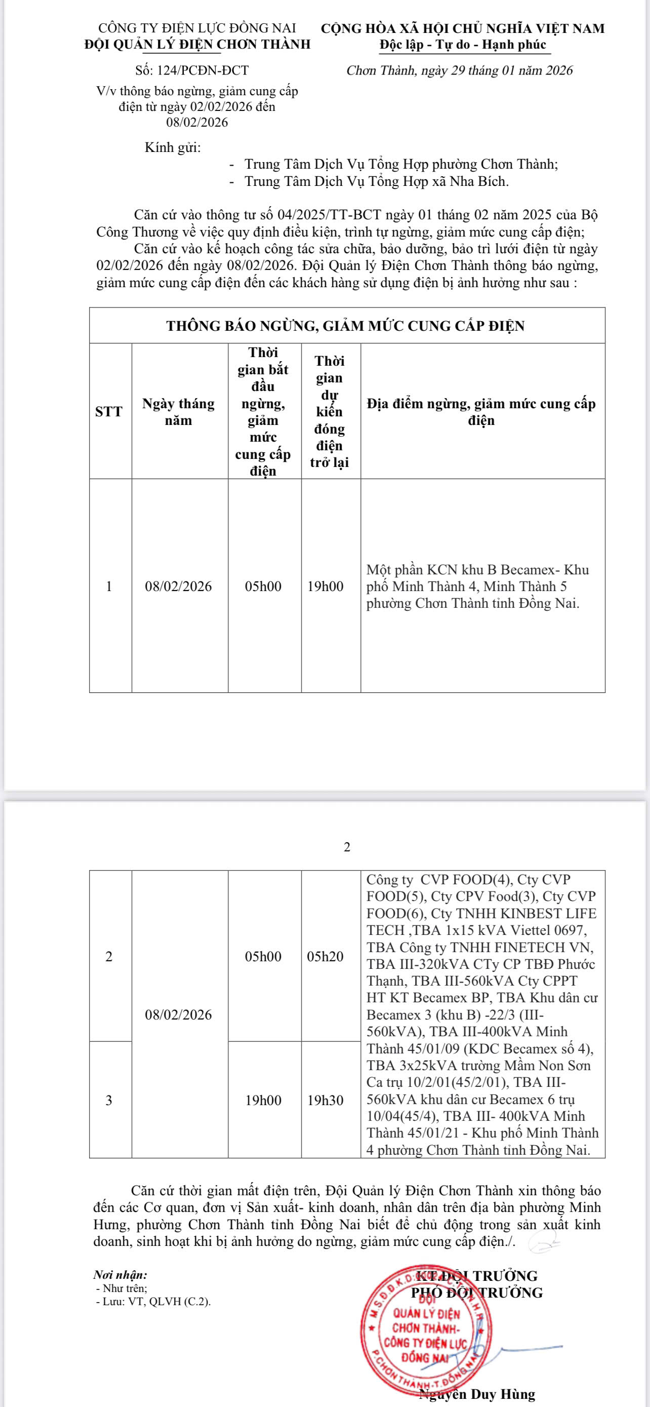 ĐỘI QUẢN LÝ ĐIỆN CHƠN THÀNH THÔNG BÁO VỀ VIỆC NGỪNG GIẢM MỨC CUNG CẤP ĐIỆN TRÊN ĐỊA BÀN PHƯỜNG MINH HƯNG