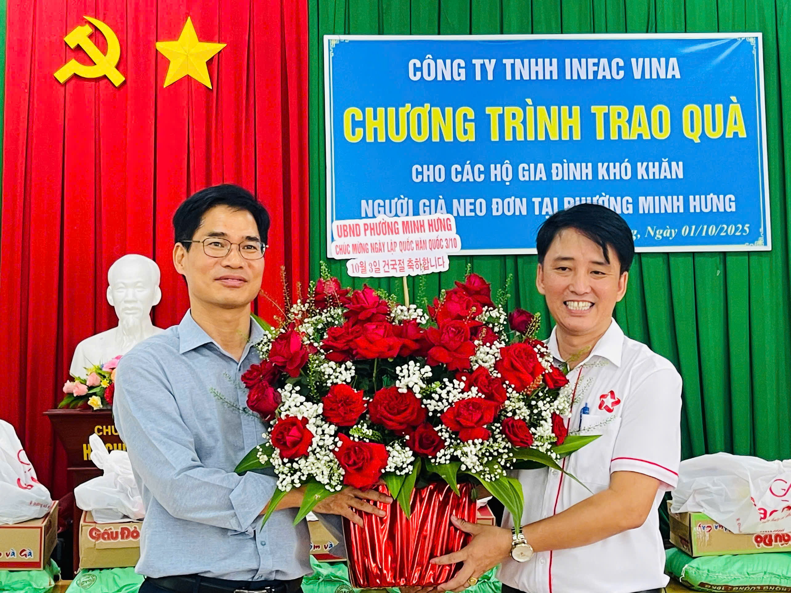 Phát biểu tại buổi trao quà, ông Nguyễn Văn Diễn - Phó Chủ tịch UBND phường gửi lời trân trọng cảm ơn đến Quý Công ty TNHH Infac Vina đã đồng hành cùng chính quyền địa phương hỗ trợ thiết thực, góp phần lan tỏa tinh thần tương thân tương ái – truyền thống quý báu của dân tộc Việt Nam. Thay mặt chính quyền địa phương, ông Nguyễn Văn Diễn đã trao thư cảm ơn Công ty vì những đóng góp cho công tác an sinh xã hội tại phường Minh Hưng. Ông hy vọng Công ty sẽ tiếp tục đồng hành cùng địa phương chăm lo cho những hoàn cảnh khó khăn trên địa bàn phường trong thời gian tới.