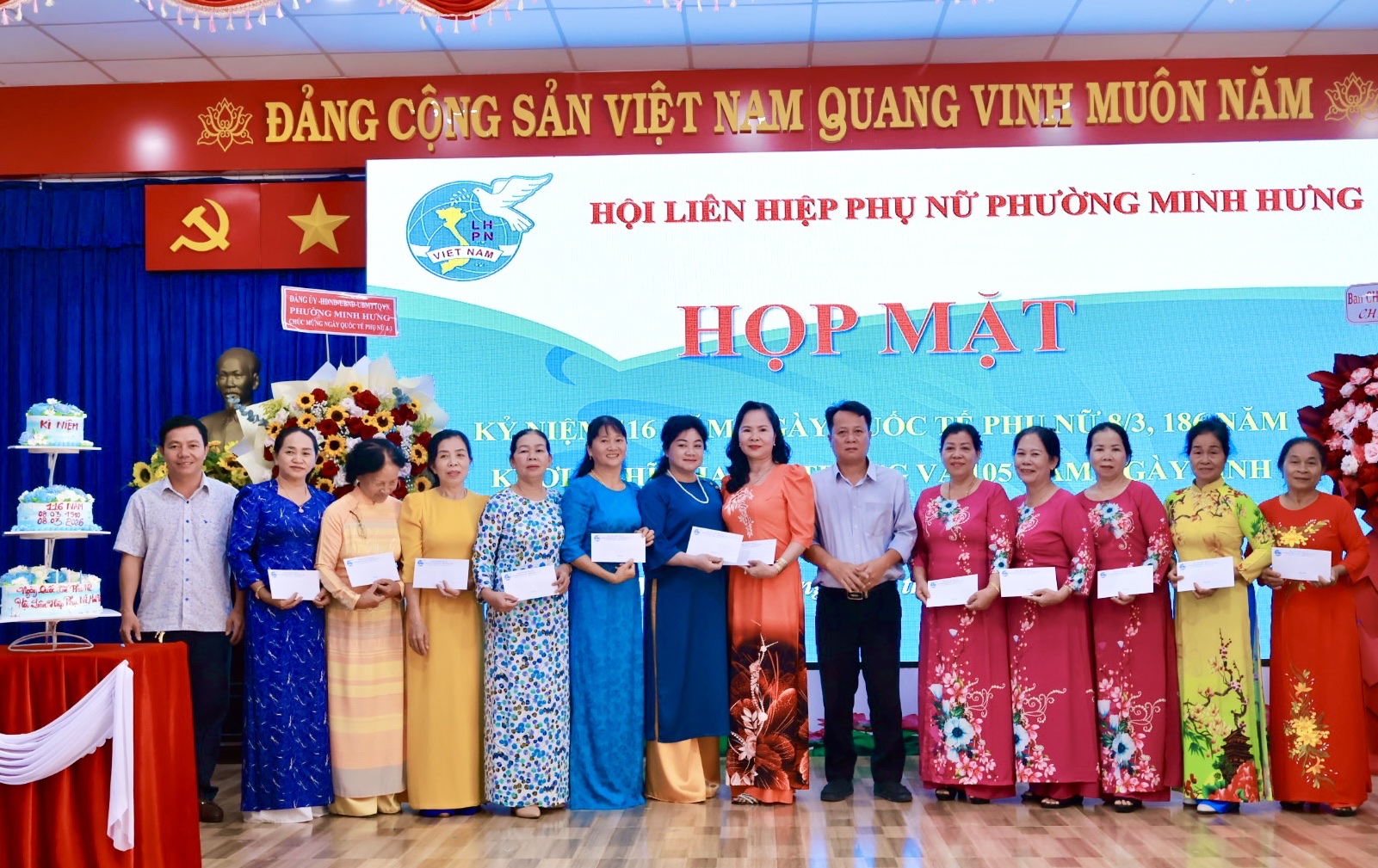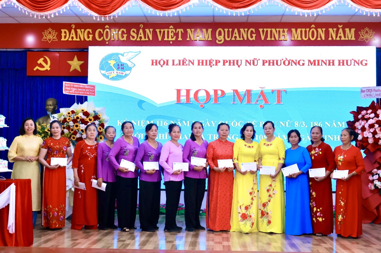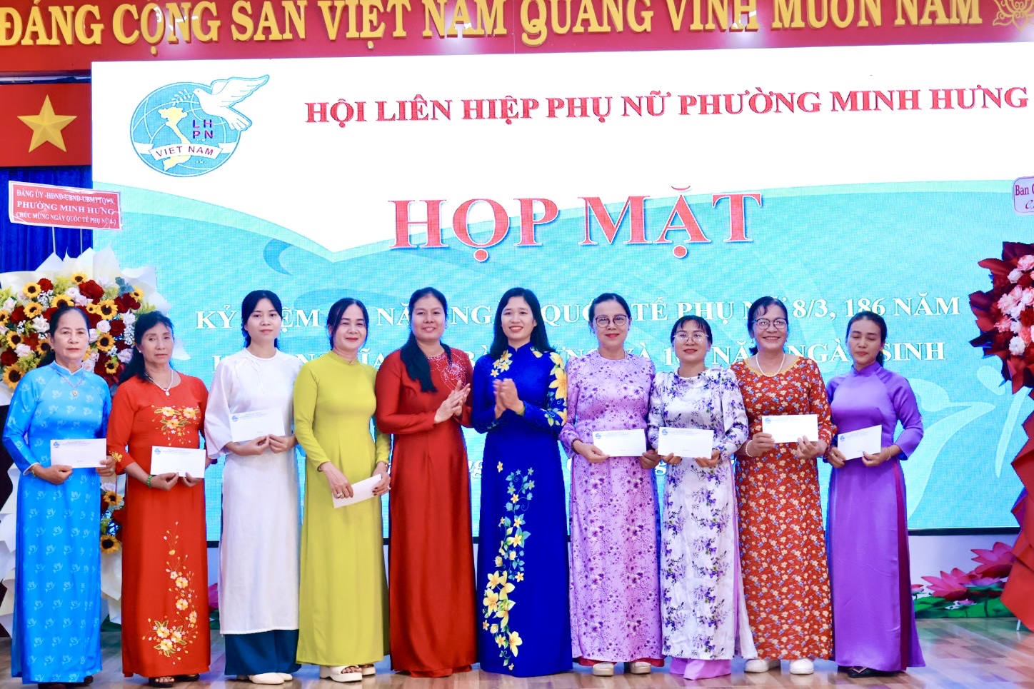 Dịp này, Hội LHPN phường Minh Hưng đã trao tặng 12 phần quà tri ân các cô, các chị Nguyên là Chủ tịch Hội LHPN phường Minh Hưng và Minh Long (cũ) và thể hiện sự trân trọng đối với những đóng góp tích cực của các thế hệ cán bộ Hội qua các thời kỳ. Đồng thời nhân dịp này Hội cũng trân trọng gửi những món quà tới tặng 90 chị trong BCH, Chi hội trưởng, chi Hội phó và HVPN tại các khu phố.