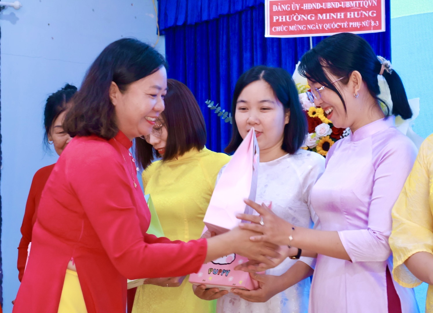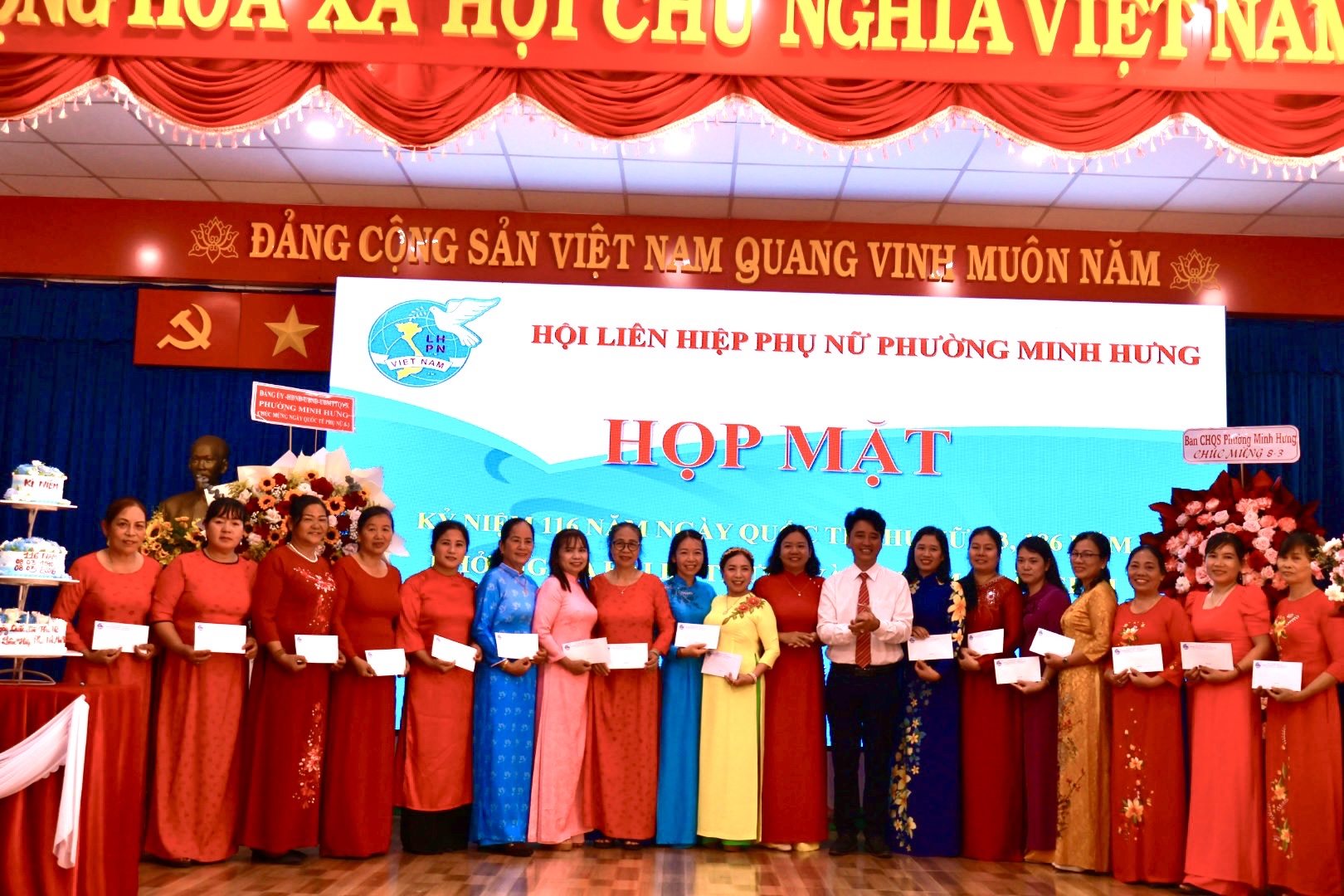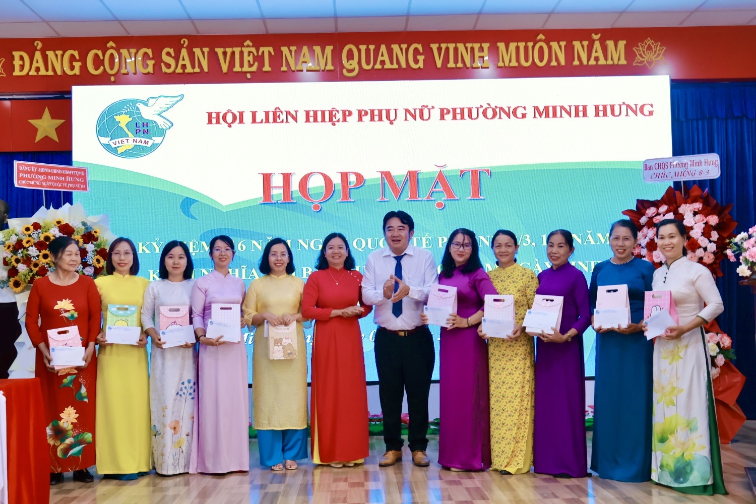 Dịp này, Hội LHPN phường Minh Hưng đã trao tặng 12 phần quà tri ân các cô, các chị Nguyên là Chủ tịch Hội LHPN phường Minh Hưng và Minh Long (cũ) và thể hiện sự trân trọng đối với những đóng góp tích cực của các thế hệ cán bộ Hội qua các thời kỳ. Đồng thời nhân dịp này Hội cũng trân trọng gửi những món quà tới tặng 90 chị trong BCH, Chi hội trưởng, chi Hội phó và HVPN tại các khu phố.