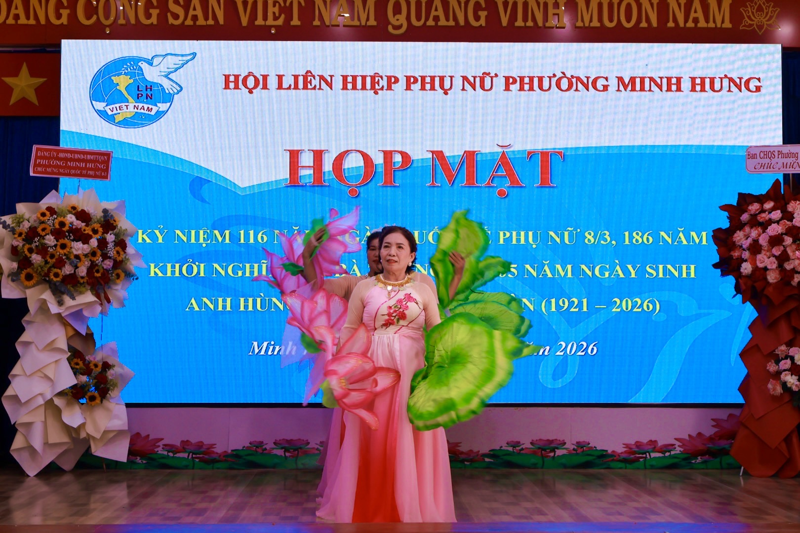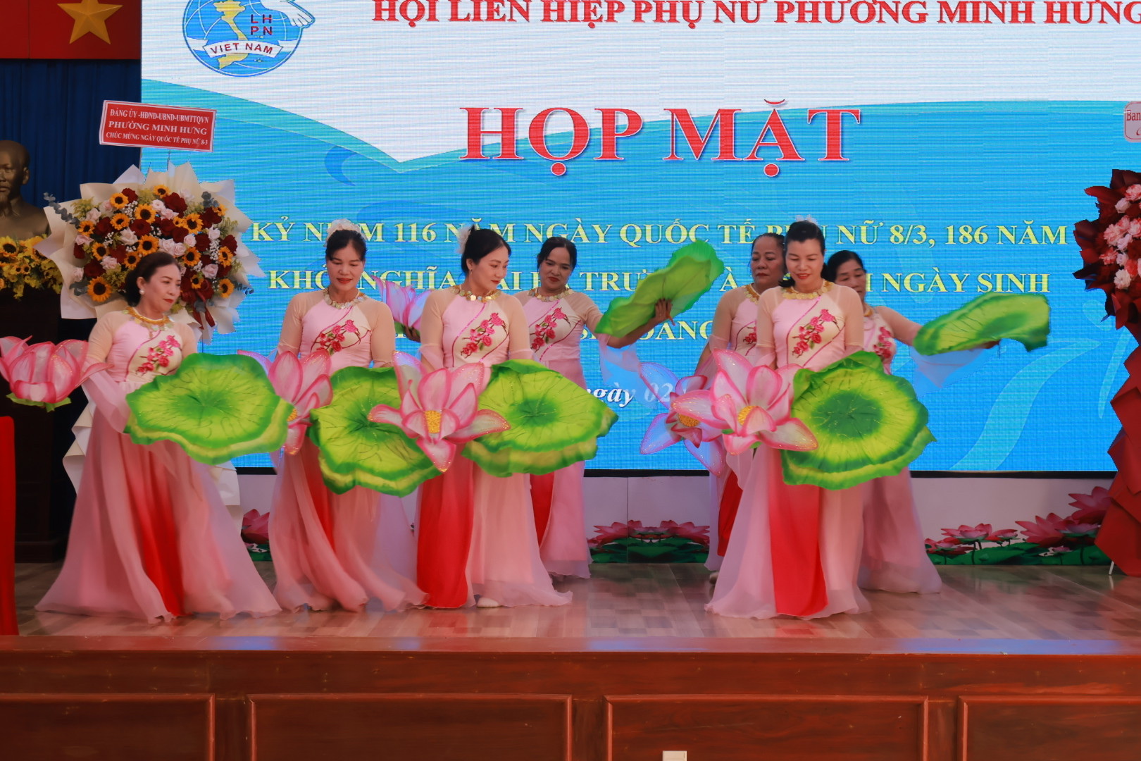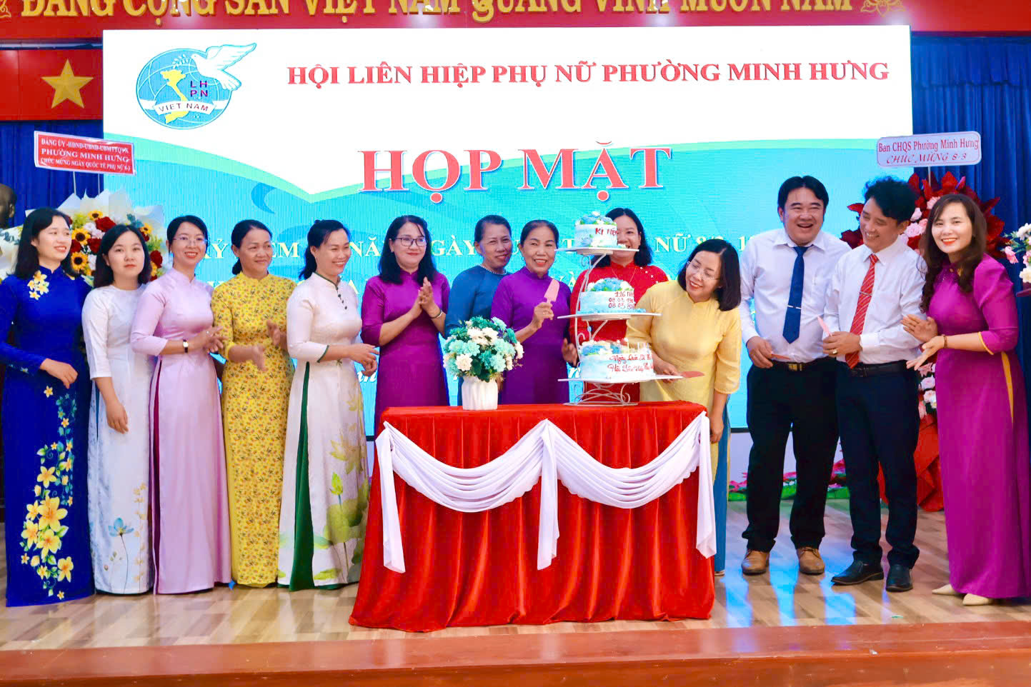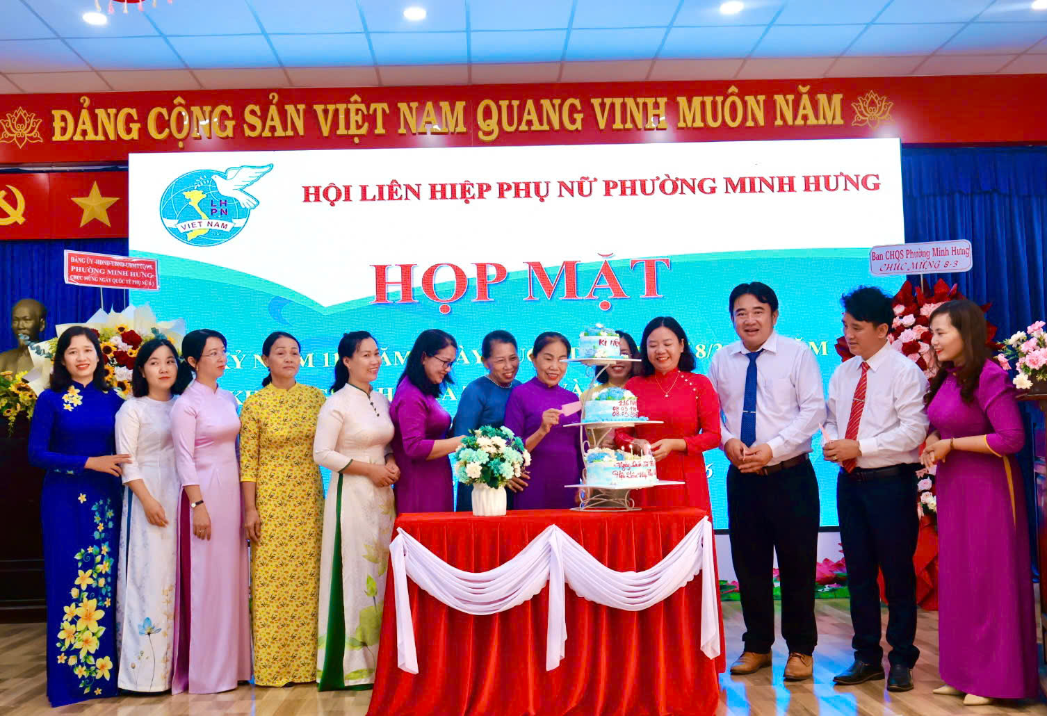 Tham dự buổi họp mặt có Đồng chí Đặng Hiếu Thảo – Phó Bí thư Thường trực Đảng ủy, cùng các đồng chí trong Thường trực HĐND – UBND – UBMTTQ Việt Nam phường và các cơ quan, ban ngành, đoàn thể phường. Các cô, các chị Nguyên là Chủ tịch Hội LHPN phường Minh Hưng và Minh Long (cũ). Cùng sự có mặt của gần 100 cán bộ, HVPN phường Minh Hưng.