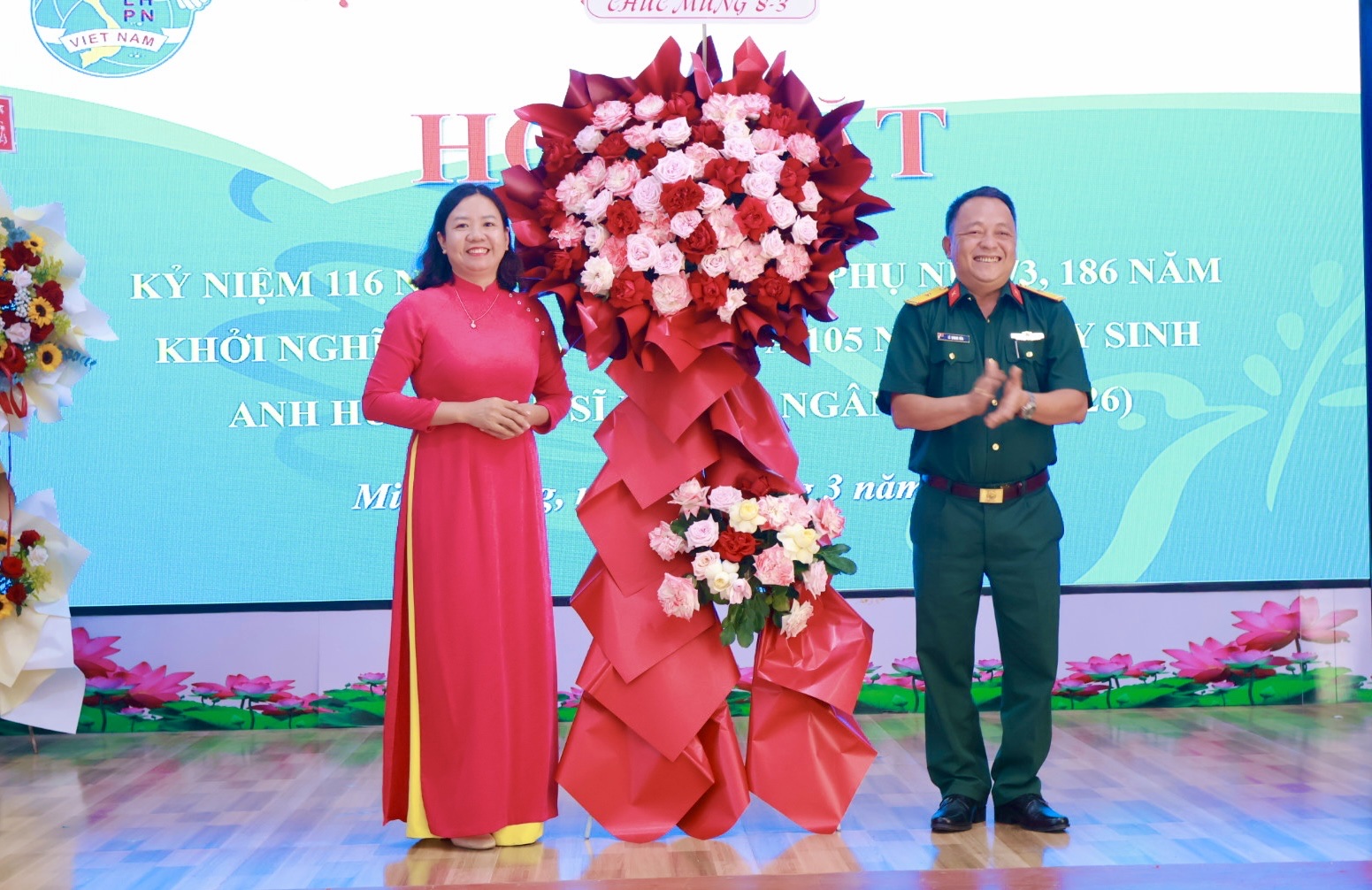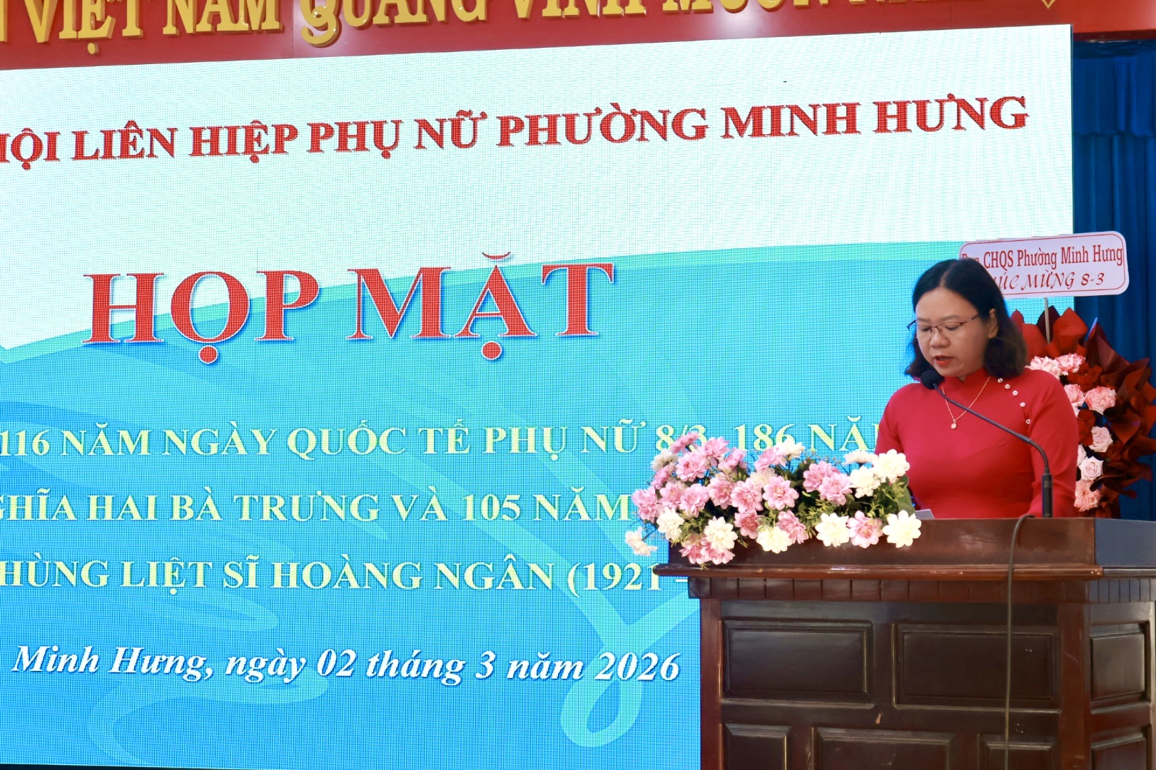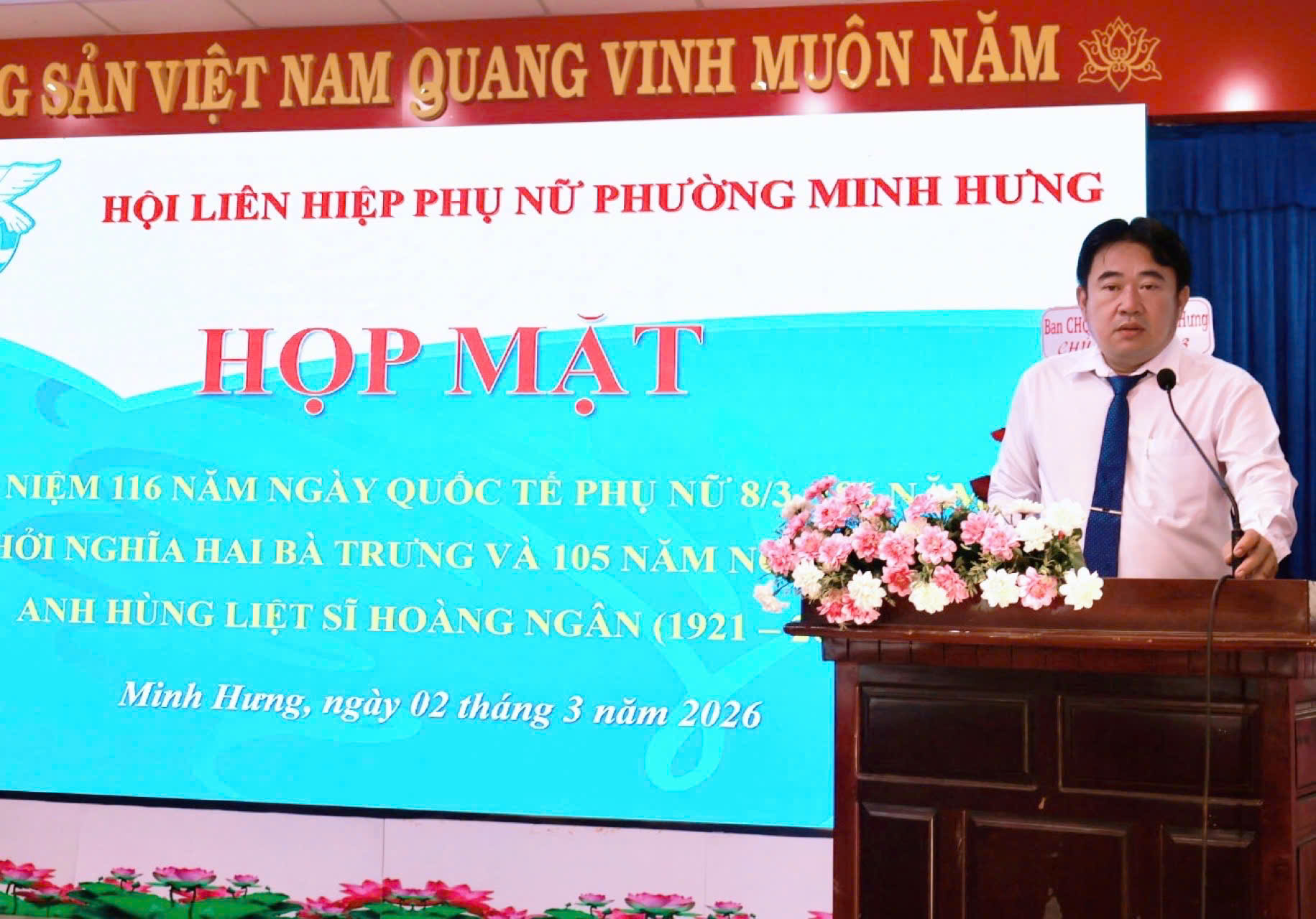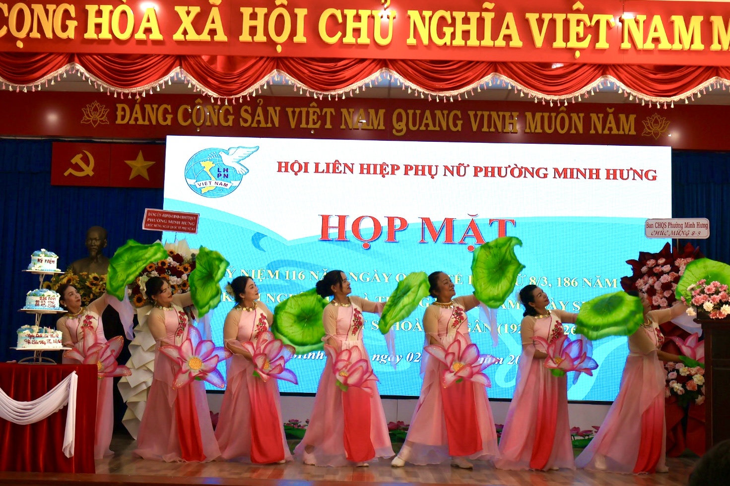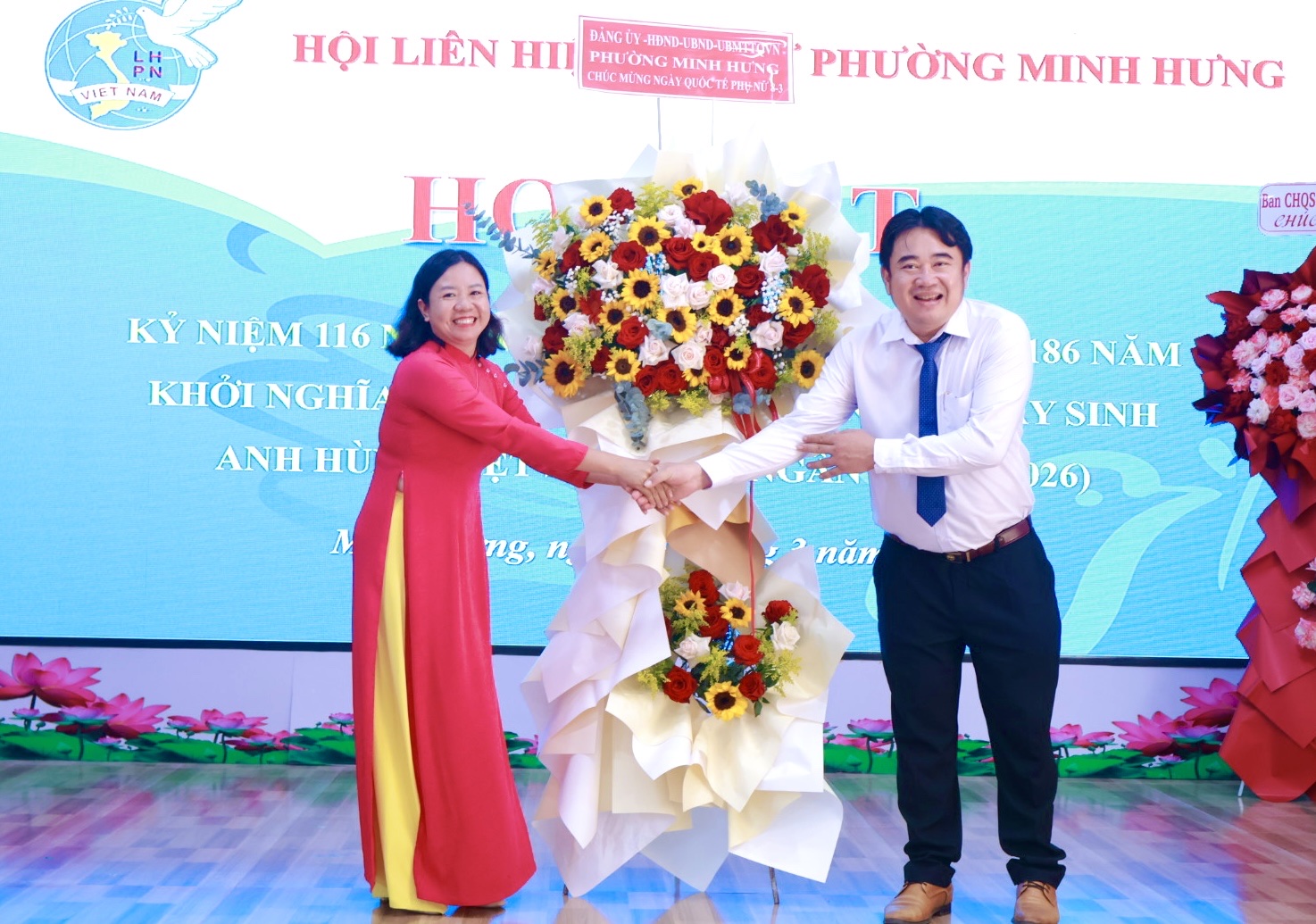 Tham dự buổi họp mặt có Đồng chí Đặng Hiếu Thảo – Phó Bí thư Thường trực Đảng ủy, cùng các đồng chí trong Thường trực HĐND – UBND – UBMTTQ Việt Nam phường và các cơ quan, ban ngành, đoàn thể phường. Các cô, các chị Nguyên là Chủ tịch Hội LHPN phường Minh Hưng và Minh Long (cũ). Cùng sự có mặt của gần 100 cán bộ, HVPN phường Minh Hưng.