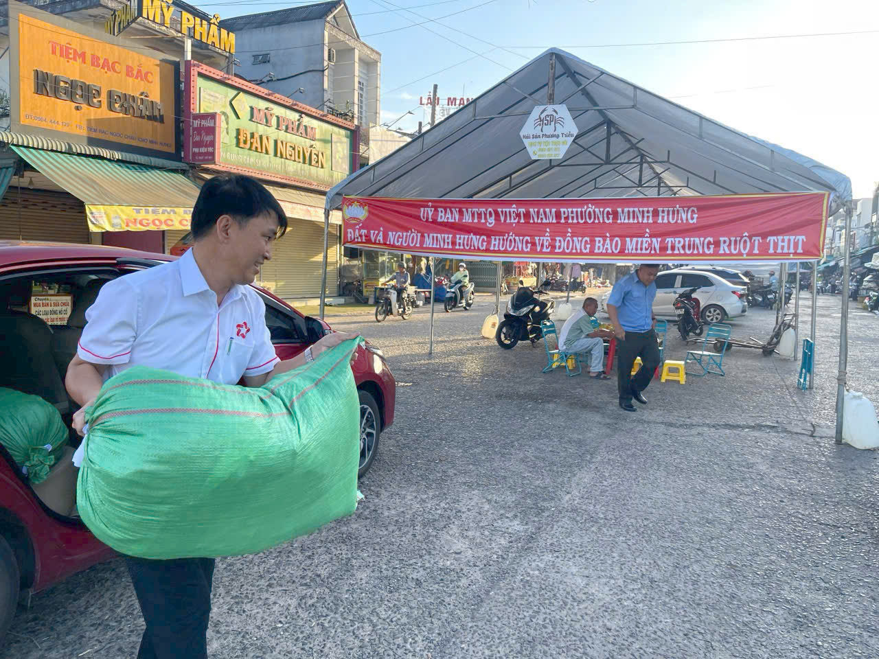 Qua 3 ngày phát động của UBMTTQ Việt Nam phường Minh Hưng, người dân trên địa bàn phường đã chung tay đóng góp từng phần quà thiết yếu: gạo, mì tôm, sữa, nước uống, đồ hộp, vật dụng sinh hoạt hằng ngày, quần áo,… và 800 đòn bánh tét. Tất cả được tập kết về điểm tiếp nhận được Ủy ban MTTQ Việt Nam phường phối hợp cùng với đoàn thiện nguyện tại địa phương, nơi có các đoàn viên thanh niên, hội viên phụ nữ, nông dân, CCB và lực lượng Công an, Quân sự phường cùng chung tay khẩn trương phân loại, đóng gói cẩn thận để kịp thời chuyển đến những khu vực chịu thiệt hại nặng nề ở vùng sâu, vùng xa tỉnh Đắk Lắk (Phú Yên cũ).Với tổng số lượng khoảng 36 tấn hàng nhu yếu phẩm, với tổng giá trị khoảng 650.000.000 đồng (Sáu trăm năm mươi triệu đồng) và 140 triệu đồng tiền mặt do nhóm thiện nguyện phường Minh Hưng vận động của các thành viên, bạn bè, người thân đóng góp.