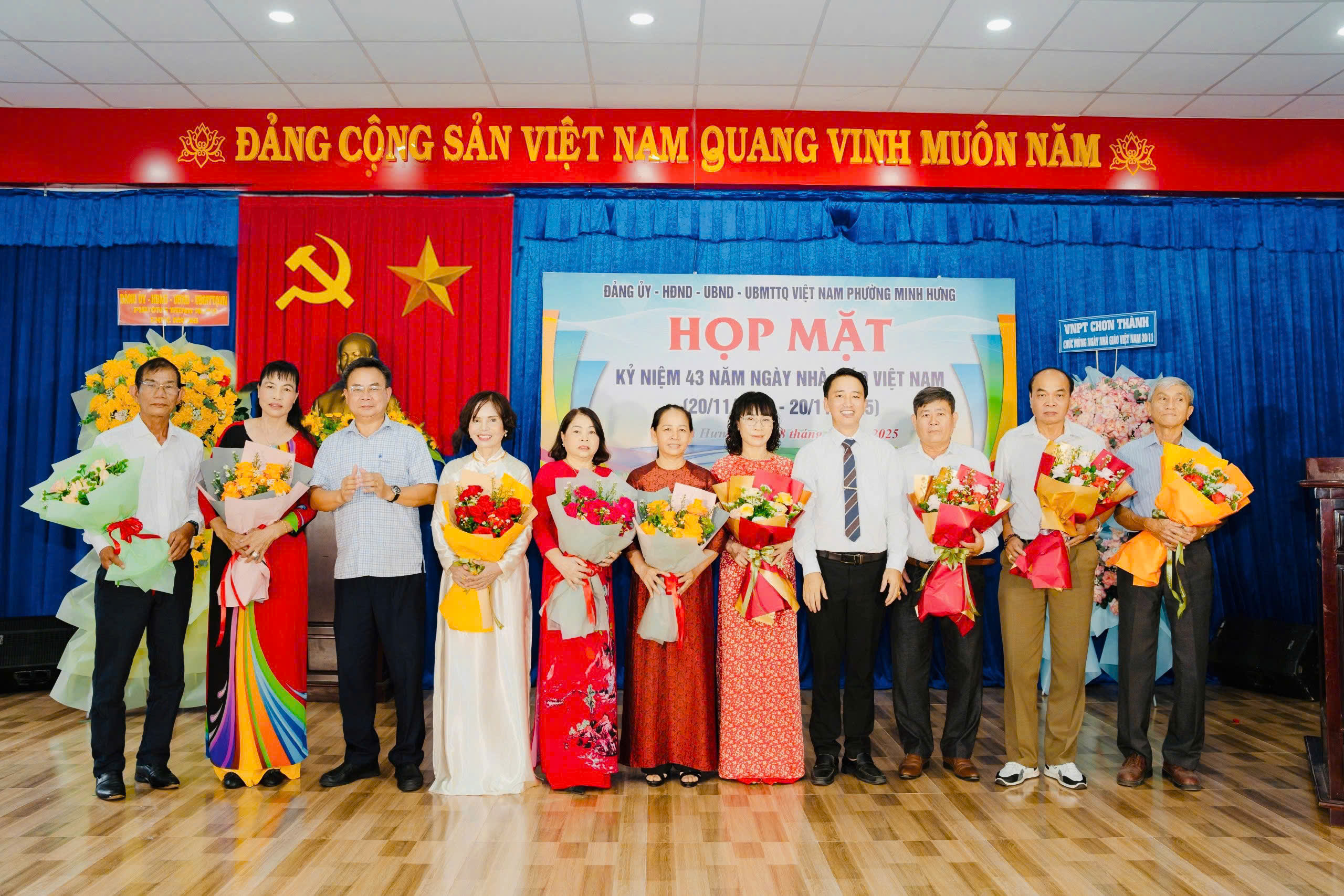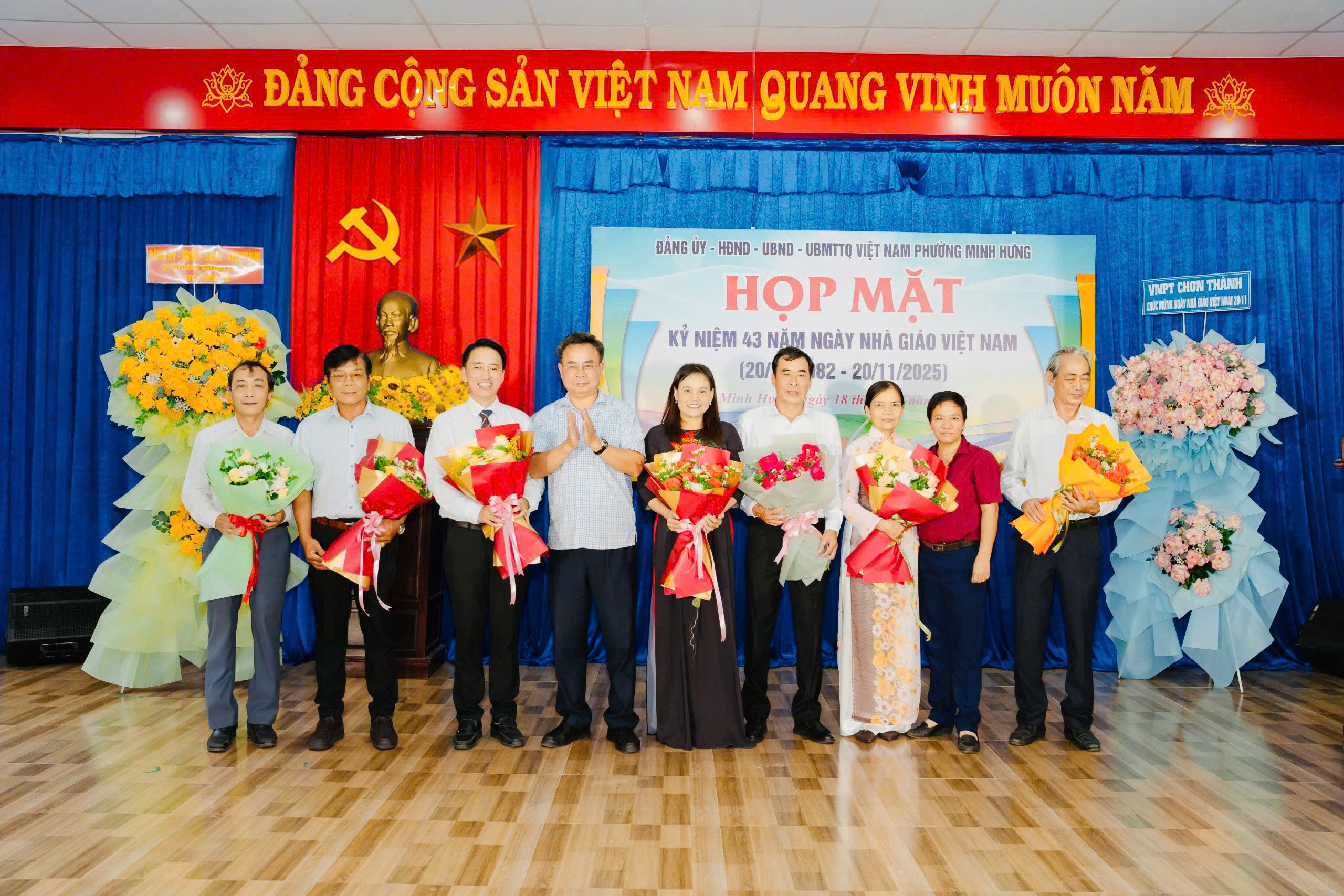 Nhân dịp này, phường Minh Hưng đã trao những bó hoa tươi thắm đến quý thầy cô nguyên là lãnh đạo và chuyên viên của Phòng Giáo dục và Đào tạo, nay đã nghỉ hưu và chuyển công tác, quý thầy cô nguyên là cán bộ quản lý của các trường đã nghỉ hưu và chuyển công tác tri ân những đóng góp của quý thầy cô cho sự nghiệp trồng người.