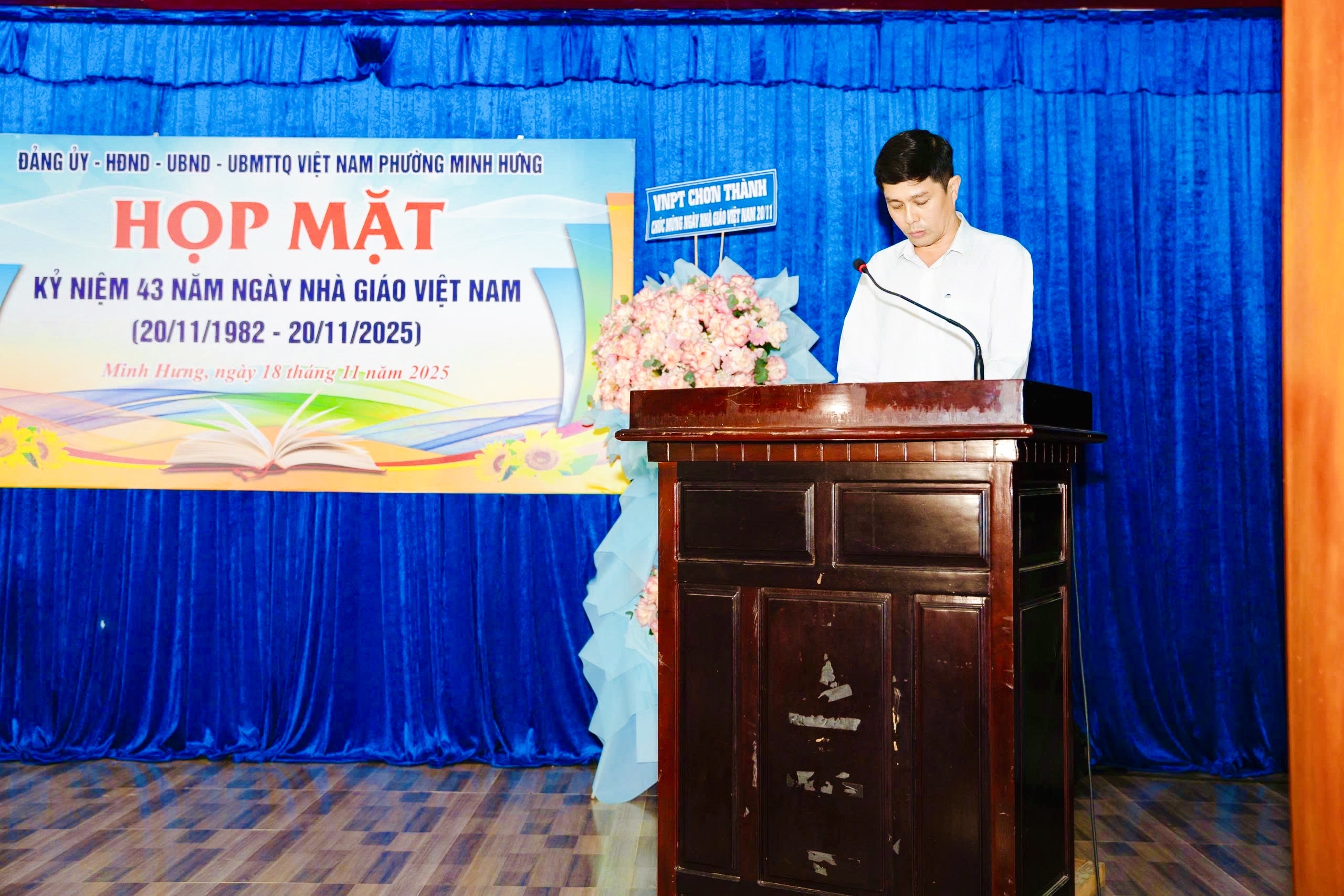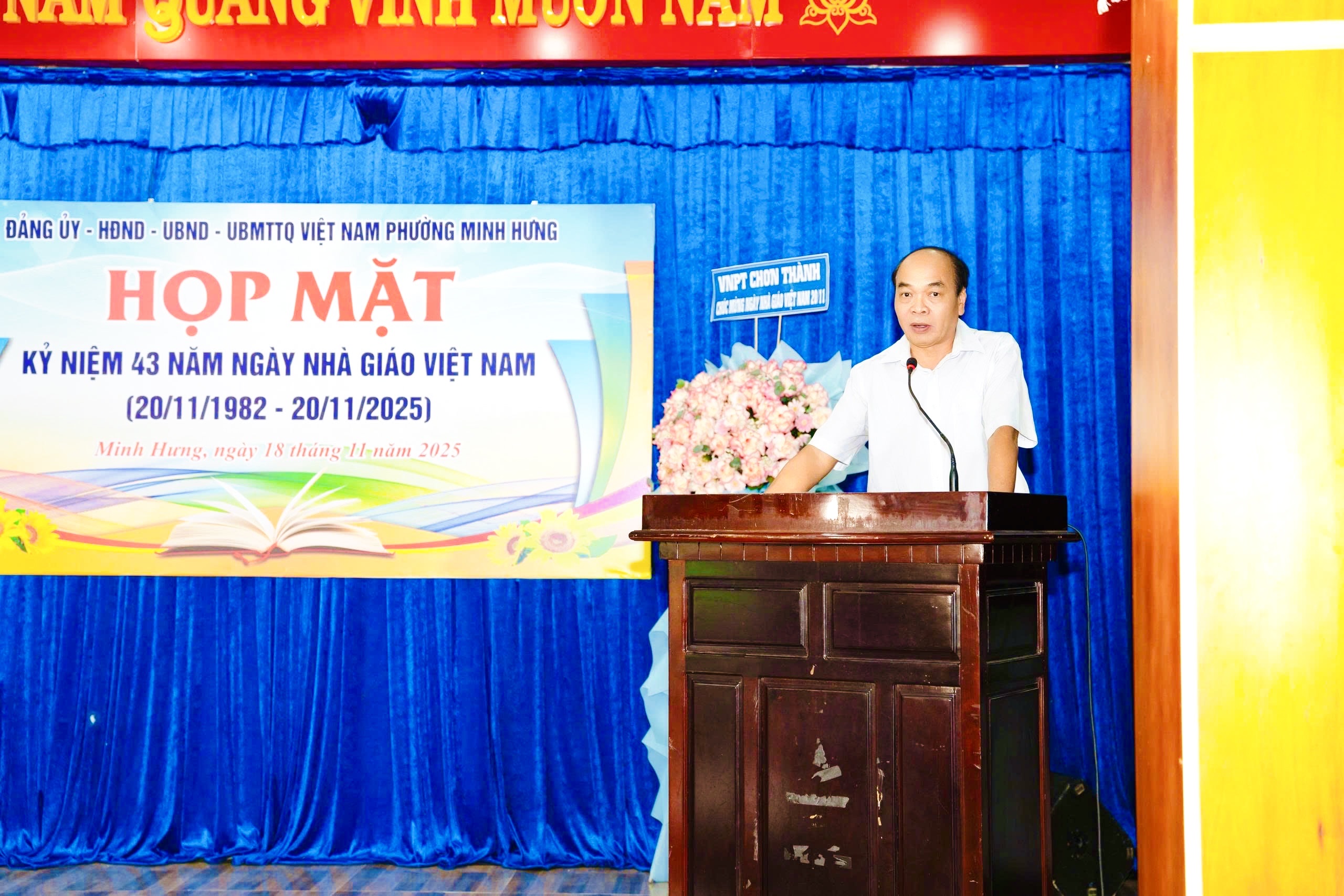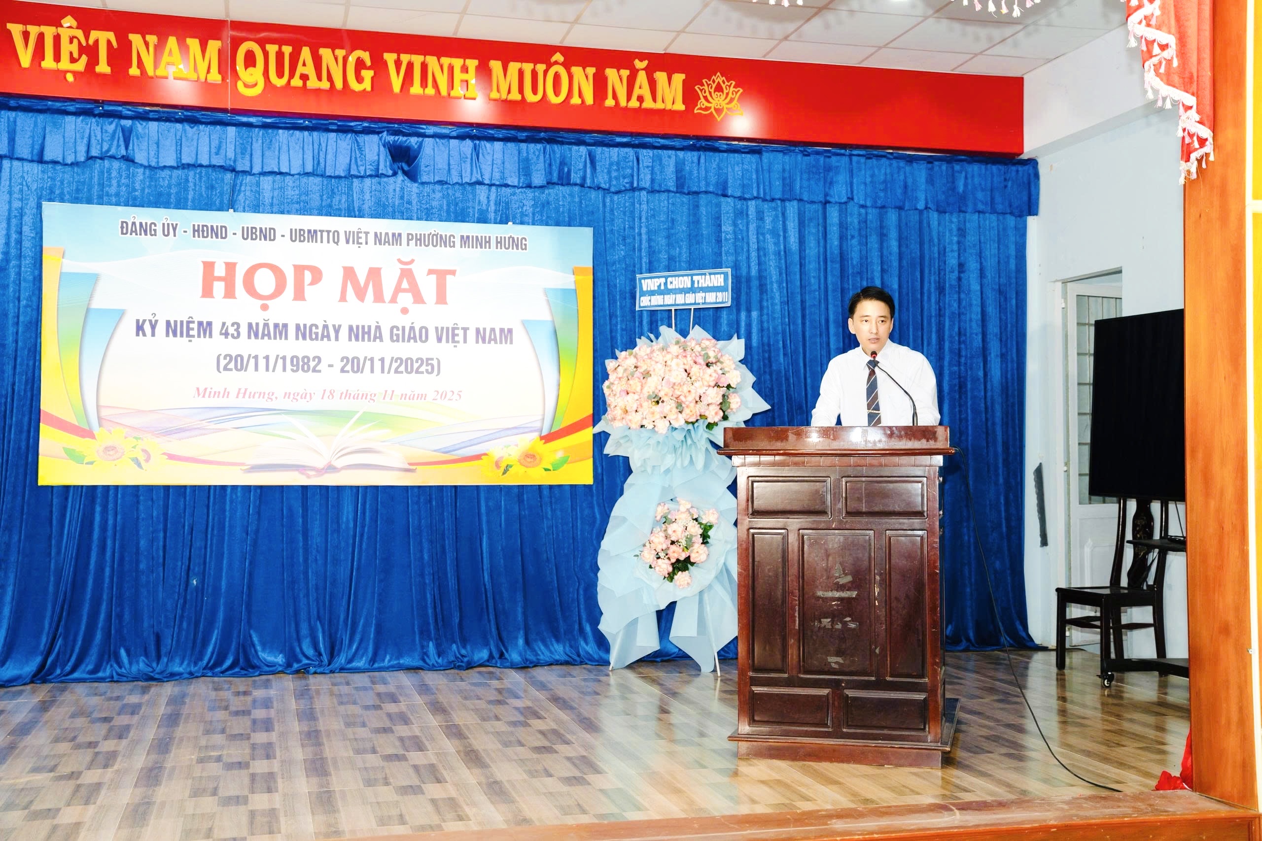 Phát biểu tại buổi lễ, ông Lê Tiến Hiếu - Bí thư Đảng ủy, Chủ tịch HĐND phường gửi đến quý thầy giáo, cô giáo lời chúc mạnh khỏe, hạnh phúc, tiếp tục giữ vững niềm tin và tình yêu nghề. Bí thư Đảng ủy chia sẻ thêm: trong những năm qua, với sự quan tâm của cấp ủy, chính quyền, cùng sự nỗ lực của đội ngũ cán bộ, giáo viên, sự nghiệp giáo dục phường Minh Hưng tiếp tục có nhiều chuyển biến tích cực: Cơ sở vật chất trường lớp được đầu tư; môi trường học tập ngày càng khang trang, xanh - sạch - đẹp. Đội ngũ giáo viên có trình độ chuyên môn vững vàng, nhiều thầy cô đạt danh hiệu giáo viên giỏi, là tấm gương sáng trong phong trào "Dạy tốt - Học tốt". Chất lượng giáo dục đại trà và mũi nhọn được duy trì; các hoạt động ngoại khóa, giáo dục kỹ năng sống, xây dựng "Trường học hạnh phúc" ngày càng đi vào chiều sâu. Những kết quả đó thể hiện rõ tinh thần trách nhiệm, lòng yêu nghề, sự tận tụy của quý thầy cô - những người lặng lẽ "gieo chữ", "trồng người" trên mảnh đất Minh Hưng thân yêu. Lãnh đạo địa phương trân trọng ghi nhận và biểu dương những đóng góp quý báu ấy.