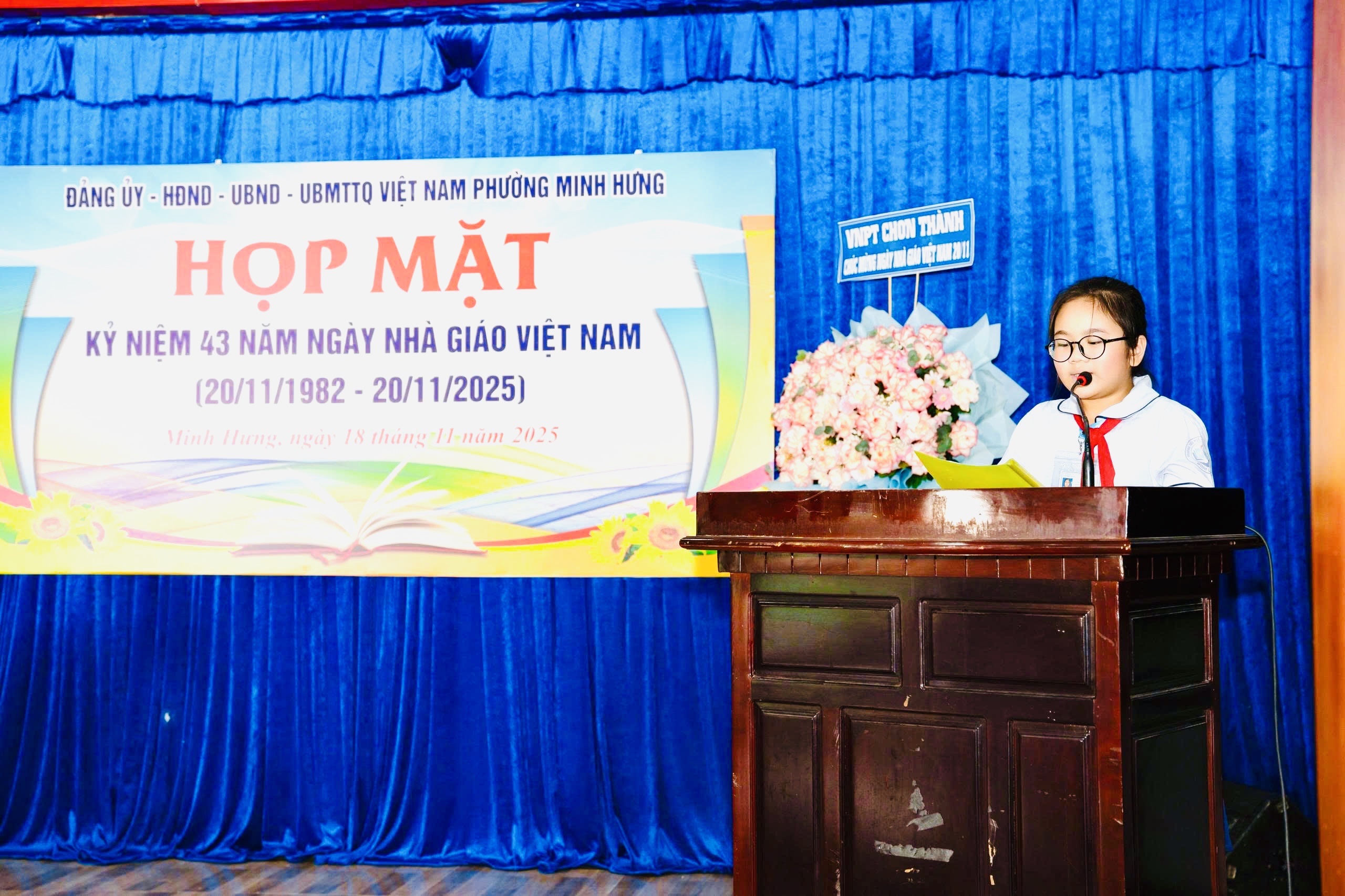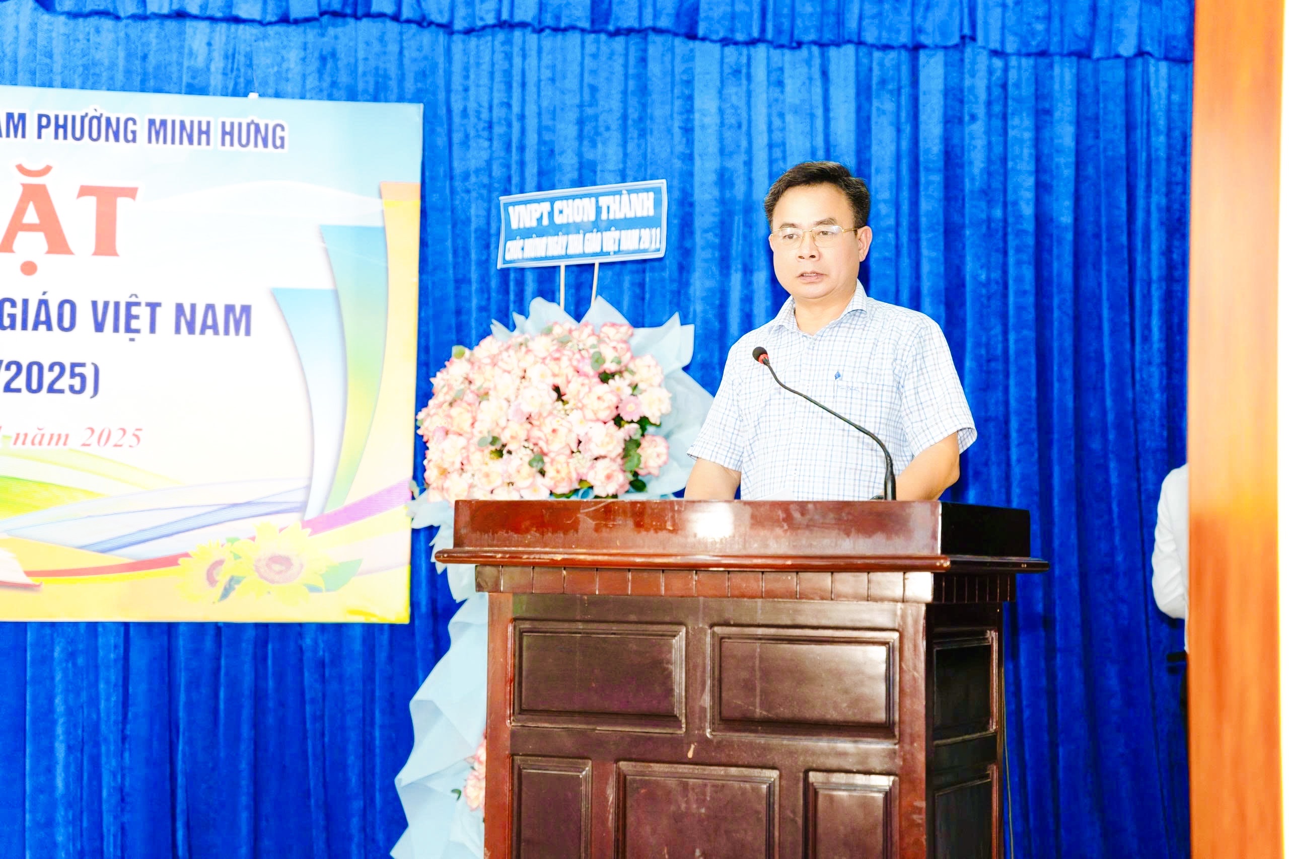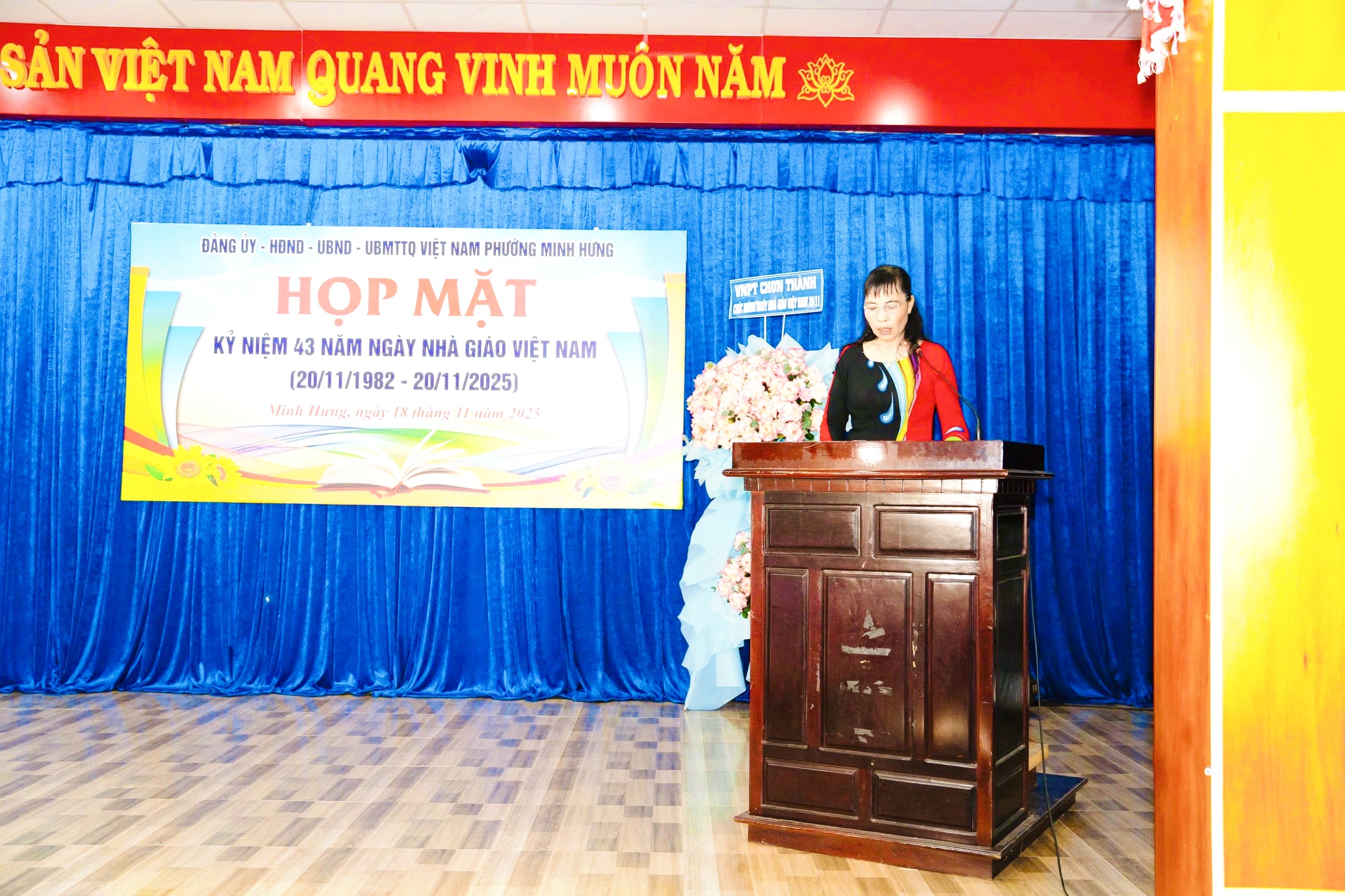 Phát biểu tại buổi lễ, ông Lê Tiến Hiếu - Bí thư Đảng ủy, Chủ tịch HĐND phường gửi đến quý thầy giáo, cô giáo lời chúc mạnh khỏe, hạnh phúc, tiếp tục giữ vững niềm tin và tình yêu nghề. Bí thư Đảng ủy chia sẻ thêm: trong những năm qua, với sự quan tâm của cấp ủy, chính quyền, cùng sự nỗ lực của đội ngũ cán bộ, giáo viên, sự nghiệp giáo dục phường Minh Hưng tiếp tục có nhiều chuyển biến tích cực: Cơ sở vật chất trường lớp được đầu tư; môi trường học tập ngày càng khang trang, xanh - sạch - đẹp. Đội ngũ giáo viên có trình độ chuyên môn vững vàng, nhiều thầy cô đạt danh hiệu giáo viên giỏi, là tấm gương sáng trong phong trào "Dạy tốt - Học tốt". Chất lượng giáo dục đại trà và mũi nhọn được duy trì; các hoạt động ngoại khóa, giáo dục kỹ năng sống, xây dựng "Trường học hạnh phúc" ngày càng đi vào chiều sâu. Những kết quả đó thể hiện rõ tinh thần trách nhiệm, lòng yêu nghề, sự tận tụy của quý thầy cô - những người lặng lẽ "gieo chữ", "trồng người" trên mảnh đất Minh Hưng thân yêu. Lãnh đạo địa phương trân trọng ghi nhận và biểu dương những đóng góp quý báu ấy.
