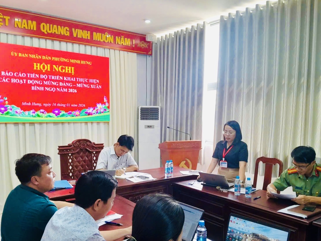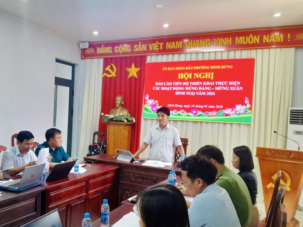 Tại cuộc họp, UBND phường Minh Hưng thông tin đã ban hành các kế hoạch làm cơ sở triển khai thực hiện các hoạt động mừng Đảng, mừng Xuân Bính Ngọ năm 2026, gồm: Kế hoạch số 06/KH-UBND ngày 08/01/2026 về tổ chức các hoạt động tuyên truyền chào mừng Đại hội đại biểu toàn quốc lần thứ XIV của Đảng, kỷ niệm 96 năm Ngày thành lập Đảng Cộng sản Việt Nam (03/02/1930 - 03/02/2026) và mừng Xuân Bính Ngọ năm 2026; Kế hoạch số 148/KH-UBND ngày 24/12/2025 về tổ chức “Hội hoa Xuân - Chào xuân Bính Ngọ năm 2026”; Kế hoạch số 146/KH-UBND ngày 23/12/2025 về tổ chức Chương trình nghệ thuật đêm Giao thừa mừng Đảng, mừng Xuân Bính Ngọ năm 2026; Kế hoạch số 153/KH-UBND ngày 26/12/2025 về tổ chức các hoạt động văn hóa, ẩm thực mừng Đảng, mừng Xuân Bính Ngọ năm 2026; Kế hoạch số 150/KH-UBND ngày 24/12/2025 về chỉnh trang đô thị mừng Đảng, mừng Xuân Bính Ngọ năm 2026; cùng với Thể lệ số 01/TL-BTC ngày 14/01/2026 về tổ chức các hoạt động văn hóa, ẩm thực mừng Đảng, mừng Xuân Bính Ngọ năm 2026.