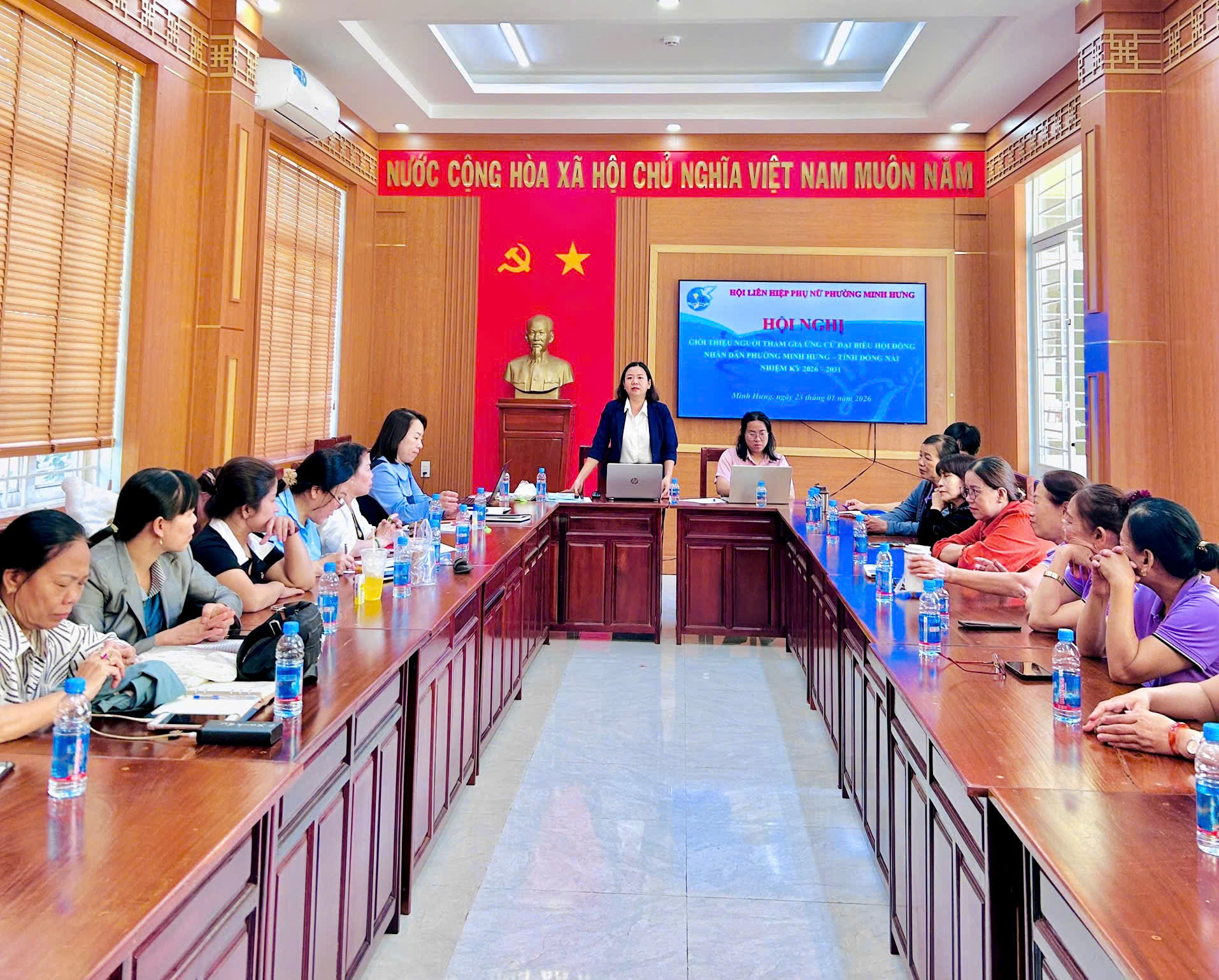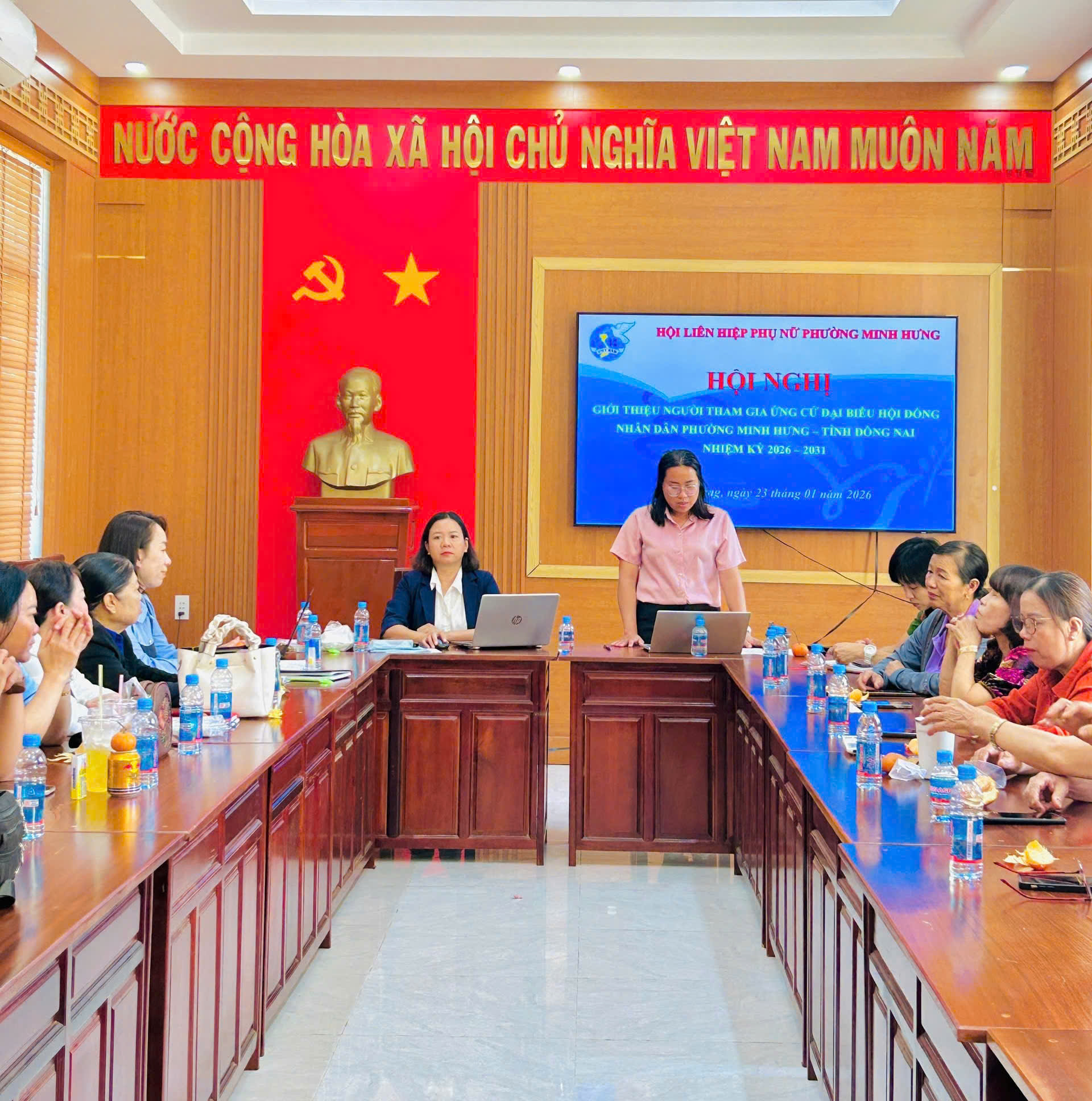 Tại hội nghị, trên cơ sở tiêu chuẩn, điều kiện của người ứng cử đại biểu HĐND và phát huy tinh thần dân chủ, trách nhiệm, Ban Chấp hành Hội LHPN phường đã thảo luận, thống nhất giới thiệu 02 đồng chí đủ tiêu chuẩn tham gia ứng cử đại biểu Hội đồng nhân dân phường Minh Hưng nhiệm kỳ 2026 – 2031, gồm: đồng chí Nguyễn Thị Vân – Chủ tịch Hội LHPN phường Minh Hưng và đồng chí Ngô Ngọc Lương – Hội viên Phụ nữ khu phố Minh Long 3.