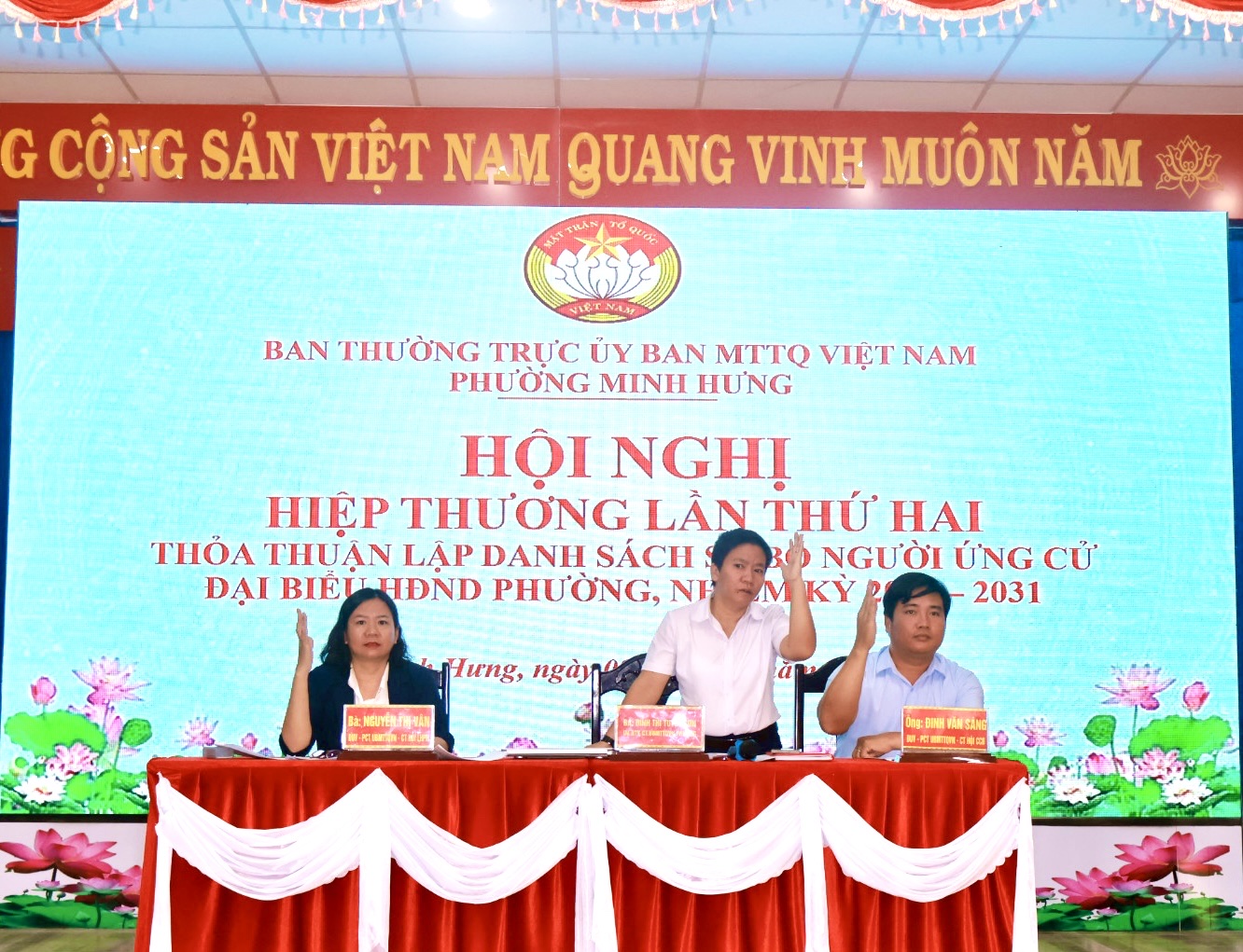 Hội nghị đã tiến hành thảo luận dân chủ, thẳng thắn, xem xét đầy đủ về tiêu chuẩn, điều kiện, cơ cấu, thành phần của từng ứng cử viên. Trên cơ sở đó, hội nghị đã biểu quyết thống nhất danh sách sơ bộ những người được giới thiệu ứng cử đại biểu Hội đồng nhân dân phường Minh Hưng, nhiệm kỳ 2026 - 2031, với tỷ lệ đồng thuận cao. Hội nghị cũng thông qua biên bản hiệp thương về cơ cấu, thành phần và số lượng người được giới thiệu ứng cử theo đúng hướng dẫn.