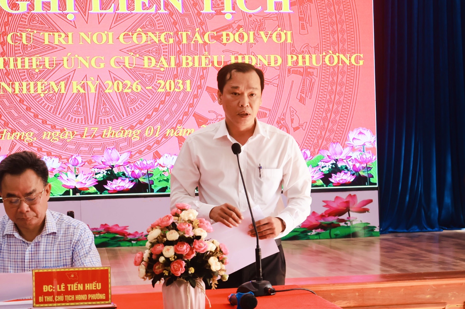 Tại hội nghị, đồng chí Lê Tiến Hiếu - Bí thư Đảng ủy, Chủ tịch HĐND phường đã tuyên bố lý do; nêu rõ mục đích, yêu cầu của hội nghị; giới thiệu Thư ký hội nghị để hội nghị biểu quyết thông qua; báo cáo số lượng cử tri được mời và số lượng cử tri có mặt; giới thiệu danh sách người được giới thiệu ứng cử và đọc tiêu chuẩn đại biểu Hội đồng nhân dân theo quy định.