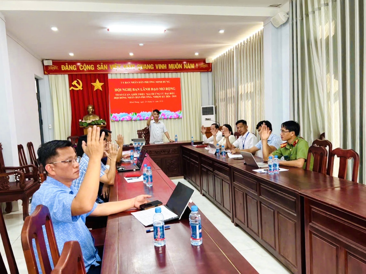 Kết luận từng nội dung thảo luận, ông Nguyễn Văn Diễn - Phó Chủ tịch UBND phường Minh Hưng đã tổng hợp, làm rõ các ý kiến nhận xét của hội nghị đối với từng trường hợp được giới thiệu ứng cử và tổ chức biểu quyết thông qua. Việc biểu quyết được thực hiện bằng hình thức giơ tay, bảo đảm công khai, dân chủ, đúng quy trình.