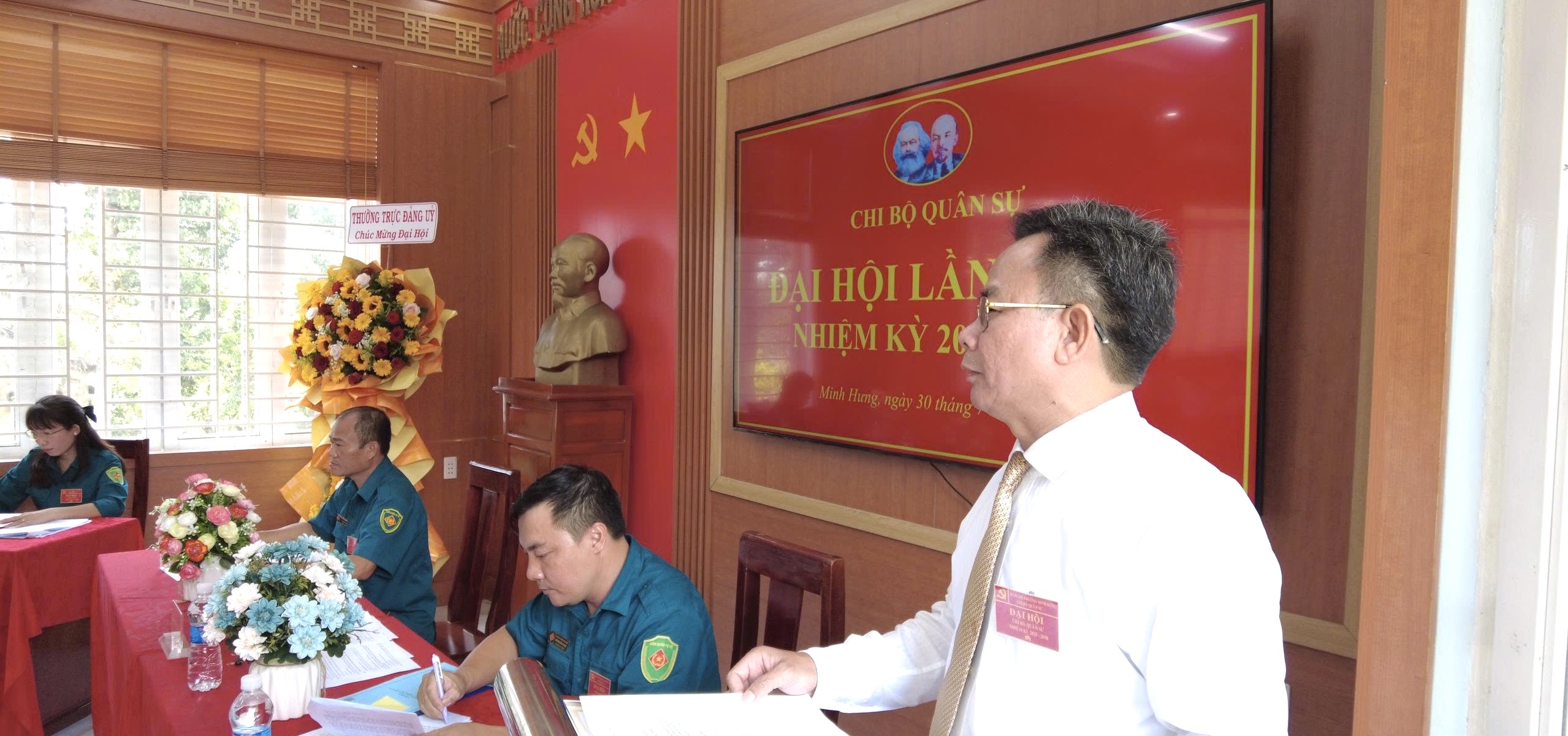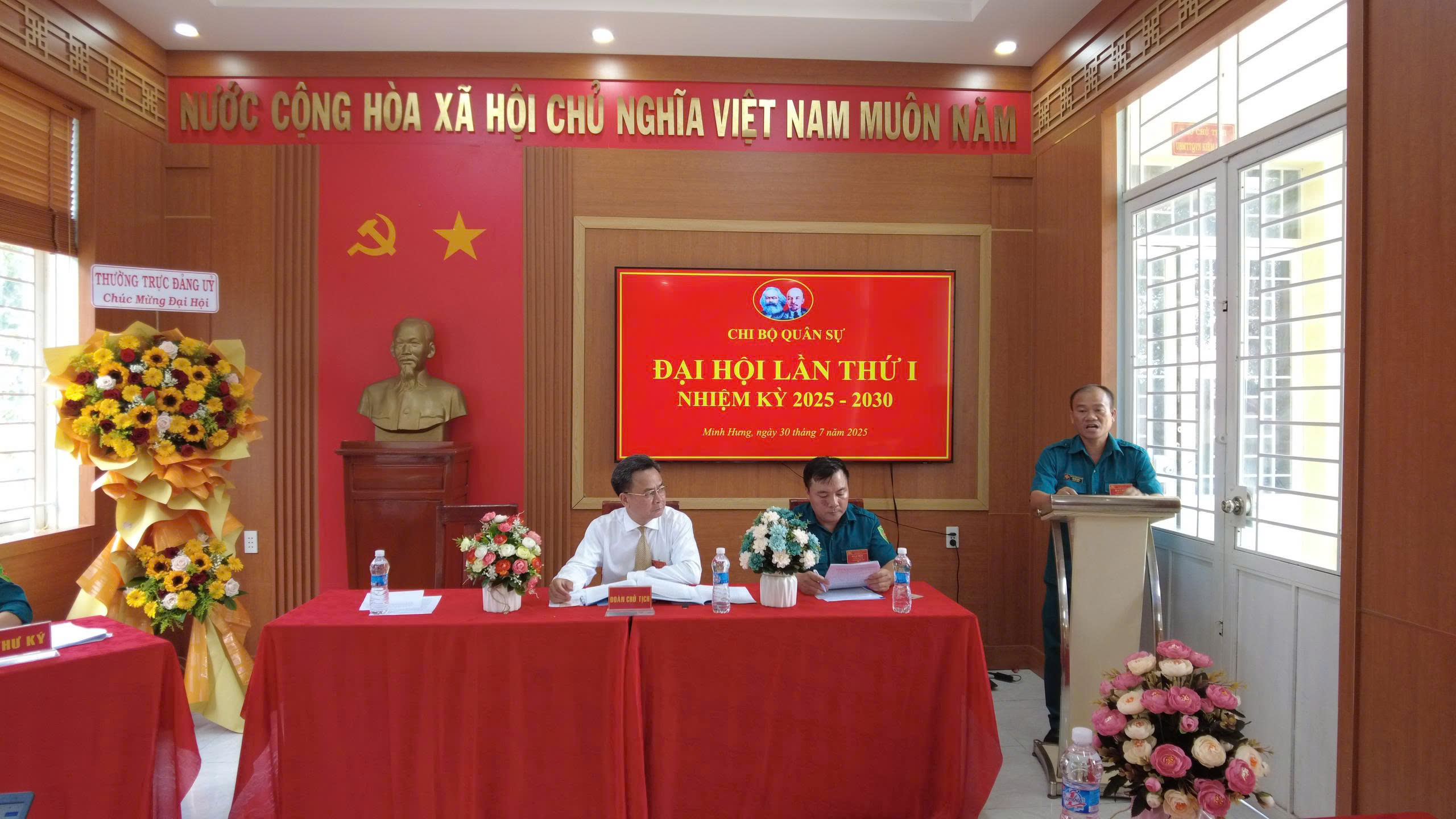 Phát biểu chỉ đạo đại hội, đồng chí Lê Tiến Hiếu - Bí thư Đảng ủy - Chủ tịch HĐND phường ghi nhận và đánh giá cao nỗ lực, kết quả lực lượng vũ trang phường đã đạt được. Đồng chí đề nghị Chi bộ quân sự phường Minh Hưng cần thực hiện tốt một số nội dung trọng tâm: Một là, tiếp tục quán triệt sâu sắc các nghị quyết, chỉ thị của Đảng về Chiến lược bảo vệ Tổ quốc trong tình hình mới. Hai là, tăng cường năng lực tham mưu của Ban Chỉ huy Quân sự phường trong điều kiện tổ chức bộ máy hành chính đang tinh gọn theo hướng chuyên nghiệp, hiệu quả. Ba là, tập trung xây dựng lực lượng dân quân tự vệ vững mạnh toàn diện "mẫu mực, tiêu biểu" nâng cao chất lượng huấn luyện, diễn tập, sẵn sàng chiến đấu. Công tác tuyển chọn, gọi công dân nhập ngũ phải được thực hiện đúng quy định, công khai, dân chủ, tuyệt đối không để xảy ra tiêu cực. Bốn là, đẩy mạnh phối hợp giữa lực lượng quân sự với công an và các lực lượng khác trên địa bàn trong bảo vệ an ninh chính trị, phòng chống tội phạm, ứng phó với thiên tai, dịch bệnh. Năm là, tiếp tục củng cố mối quan hệ đoàn kết quân - dân, nâng cao chất lượng công tác chính trị - tư tưởng trong lực lượng vũ trang. Sáu là, Phát huy sức mạnh tổng hợp của hệ thống chính trị, kế thừa truyền thống, nâng tầm tổ chức, đổi mới phương thức lãnh đạo, đẩy mạnh hội nhập, đoàn kết - kỷ cương - sáng tạo - phát triển, xây dựng lực lượng vũ trang phường vững mạnh toàn diện, đủ năng lực tham mưu và tổ chức thực hiện thắng lợi mọi nhiệm vụ quốc phòng - an ninh trong giai đoạn mới.