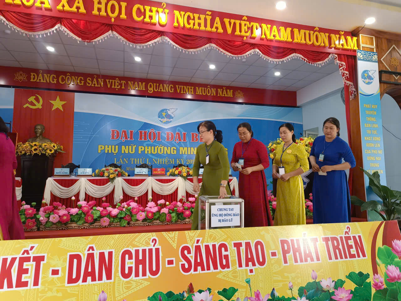 Hàng năm, Hội làm tốt công tác từ thiện nhân đạo, chương trình triệu phần quà san sẻ yêu thương với 3.987 phần quà, trị giá khoảng 2 tỷ đồng. Hỗ trợ phương tiện sinh kế cho 10 hội viên phụ nữ có hoàn cảnh khó khăn, với tổng số tiền 21.600.000 đồng, giới thiệu việc làm cho 427 hội viên phụ nữ. Phối hợp với Ngân hàng Chính sách xã hội quản lý tốt nguồn vốn, giúp hội viên phụ nữ có điều kiện vay vốn phát triển kinh tế, giải quyết việc làm, đến nay tổng dư nợ trên địa bàn là 33.243.900.000 đồng, cho 526 thành viên vay. Trong nhiệm kỳ, Hội đã nhận đỡ đầu 10 trẻ mồ côi, trẻ có hoàn cảnh khó khăn với tổng kinh phí khoảng 26.800.000 đồng. Ngoài ra Hội còn trao tặng nhiều học bổng, xe đạp, đồ dùng học tập, sách vở,… cho 47 học sinh có hoàn cảnh khó khăn nhân dịp đầu năm học mới, với tổng trị giá 42.500.000 đồng.... Thực hiện lời kêu gọi của UBMTTQVN phường Minh Hưng ủng hộ đồng bào miền Trung, miền Bắc khắc phục hậu quả cơn bão số 10 (BUALOI), đại hội cũng đã phát động trong cán bộ, hội viên phụ nữ vận động, quyên góp được 8.250.000 đồng.