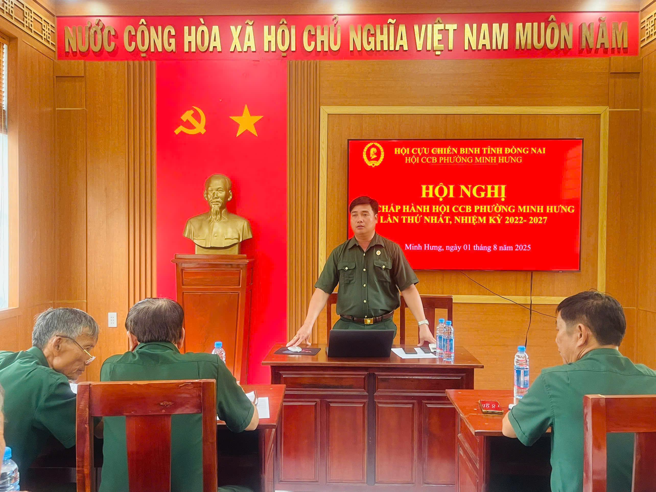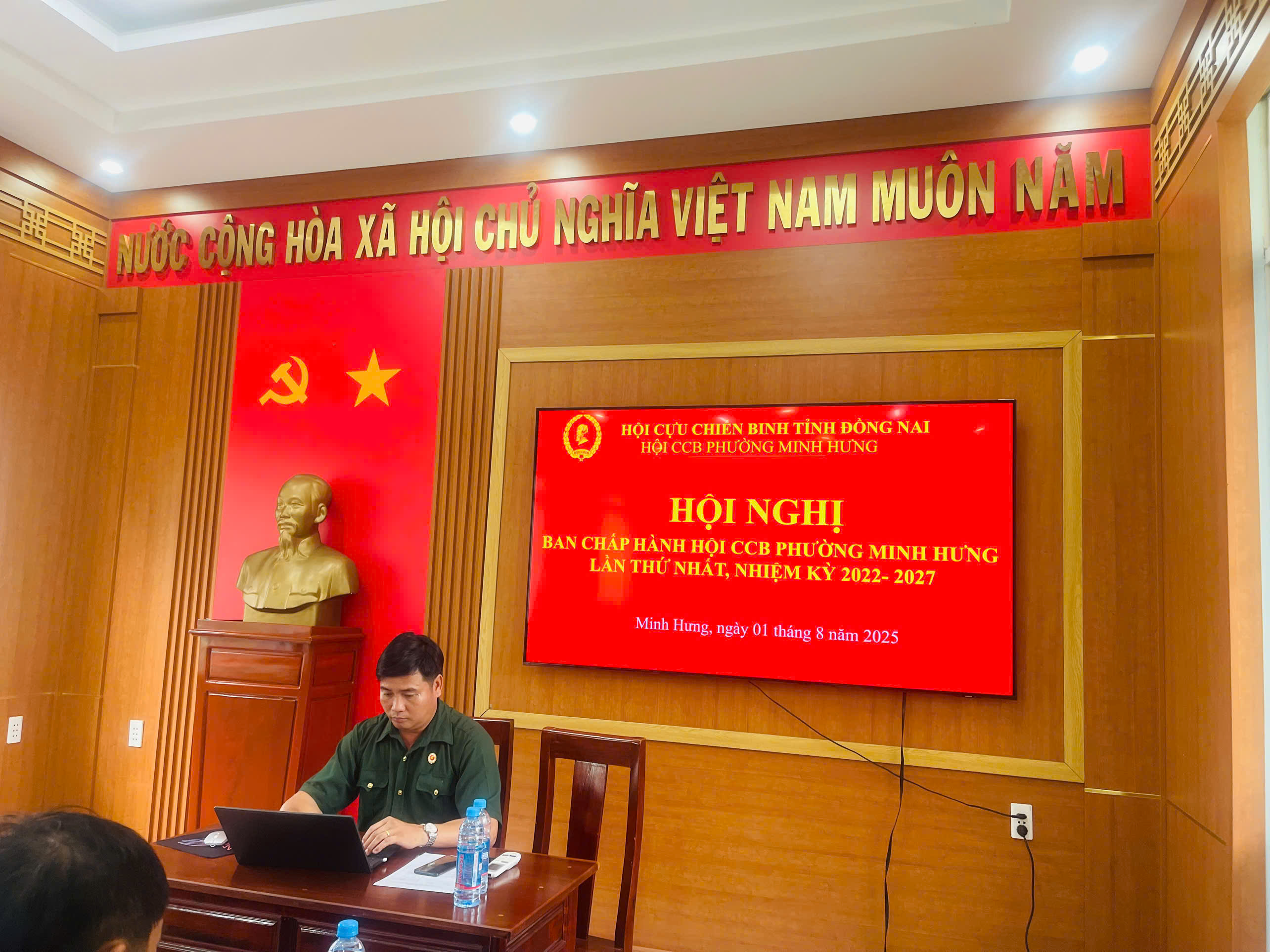 Hội Cựu chiến binh phường Minh Hưng được thành lập theo Quyết định số 50/QĐ-HCCB ngày 15/7/2025 của Hội Cựu chiến binh tỉnh Đồng Nai về việc thành lập Hội Cựu chiến binh phường Minh Hưng, tỉnh Đồng Nai. Tại hội nghị, Hội Cựu chiến binh phường công bố Quyết định thành lập Hội, các Quyết định nhân sự; thông qua quy chế làm việc của Ban chấp hành; triển khai nhiệm vụ 6 tháng cuối năm 2025; Chỉ định Ban chấp hành Hội Cựu chiến binh phường gồm 25 đồng chí; Ban Thường vụ gồm 7 đồng chí; Ủy ban Kiểm tra gồm 5 đồng chí.