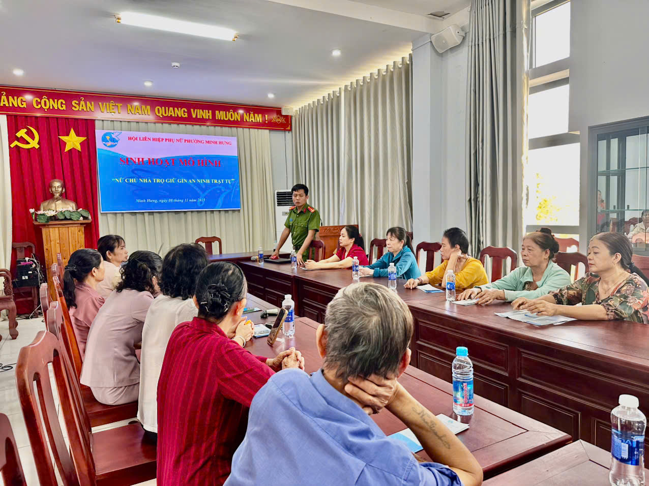 Buổi sinh hoạt giúp các thành viên mô hình nâng cao ý thức, trách nhiệm trong công tác tự quản, góp phần giữ vững an ninh trật tự, an toàn xã hội, xây dựng môi trường sống văn minh, lành mạnh và an toàn trên địa bàn phường Minh Hưng. Đồng thời mong muốn của Hội phụ nữ phường thông qua các chủ nhà trọ công tác tuyên truyền các chủ trương, chính sách của Đảng, phát luật của Nhà nước được kịp thời đến với người thuê trọ, đặc biệt là những công nhân trên địa bàn.