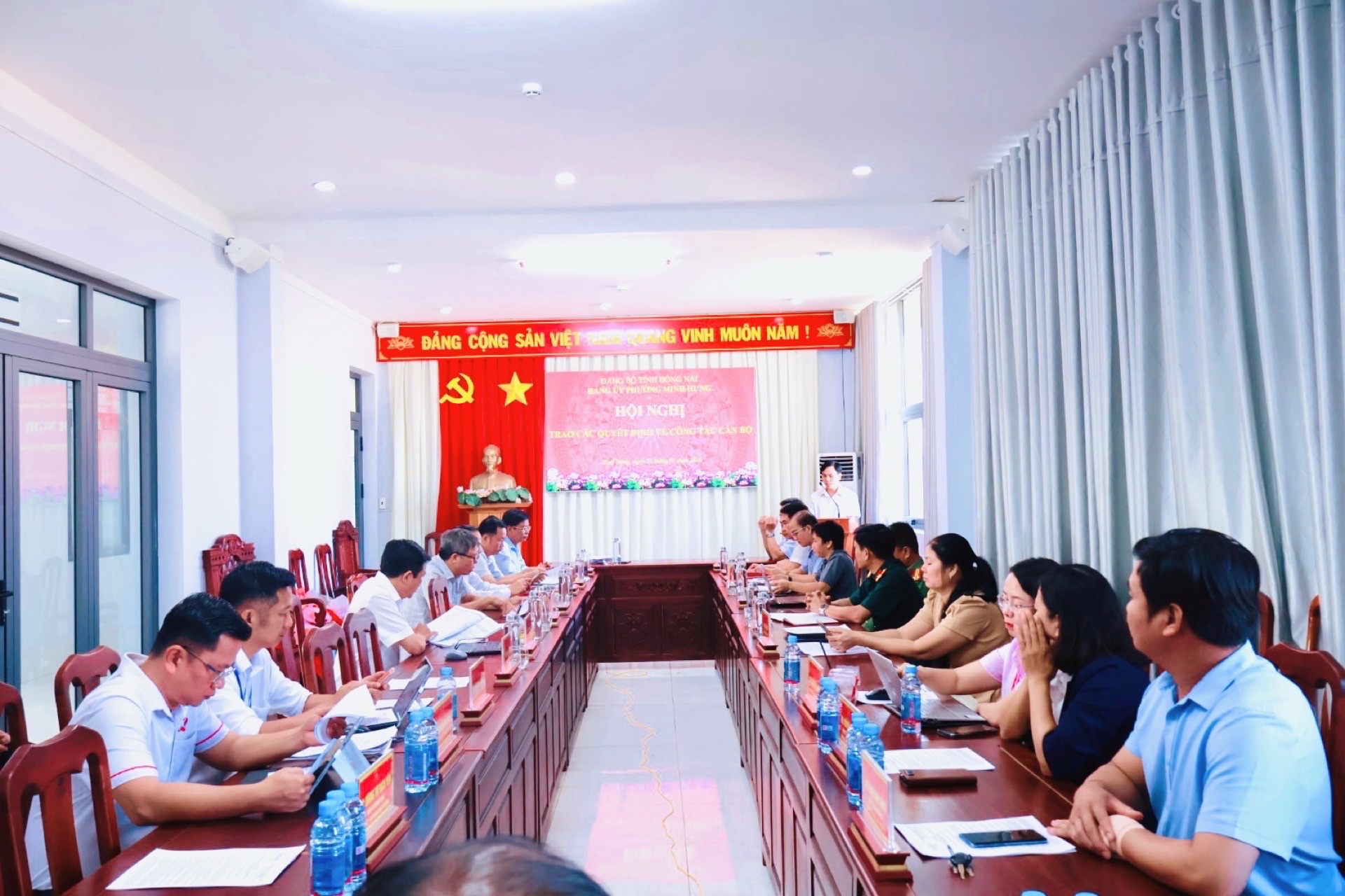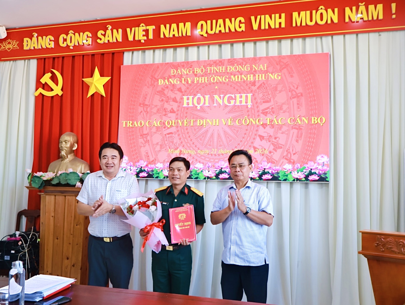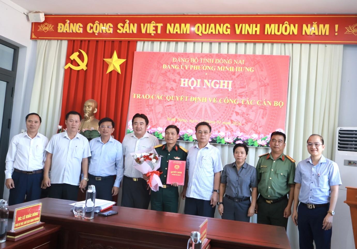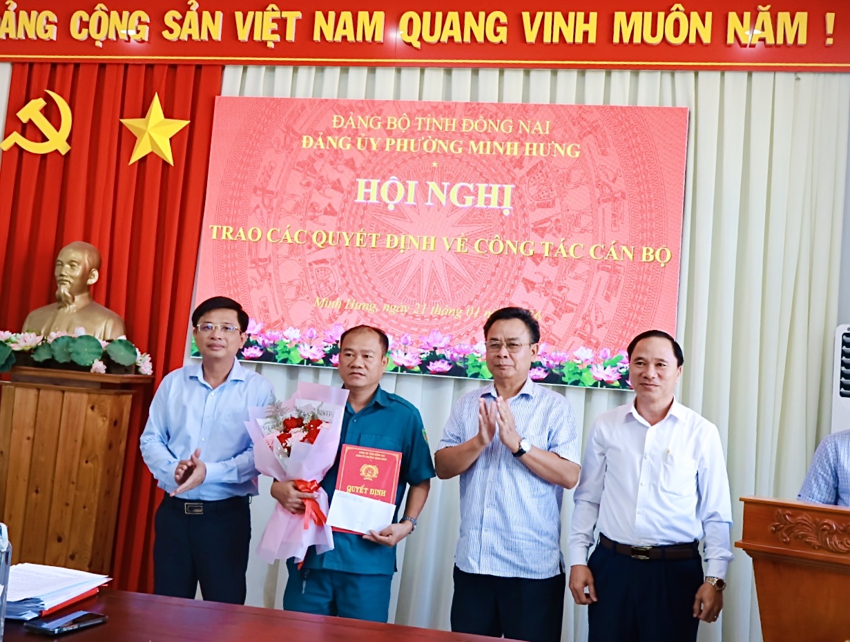 Tại Hội nghị, đồng chí Bùi Quang Anh Giao – Ủy viên Ban Thường vụ Đảng ủy, Trưởng Ban Xây dựng Đảng đã công bố các Quyết định của cấp có thẩm quyền, bao gồm: Quyết định miễn nhiệm chức vụ Chỉ huy trưởng Ban Chỉ huy Quân sự phường Minh Hưng; Quyết định bổ nhiệm chức vụ cán bộ; Quyết định chỉ định bổ sung Ủy viên Ban Chấp hành Đảng bộ, Ban Thường vụ Đảng ủy phường Minh Hưng nhiệm kỳ 2025 – 2030 đối với đồng chí Trung tá Trần Kim Giao – Phó Chỉ huy trưởng Ban Chỉ huy PTKV4 – Bình Long, Bộ Chỉ huy Quân sự tỉnh Đồng Nai.
