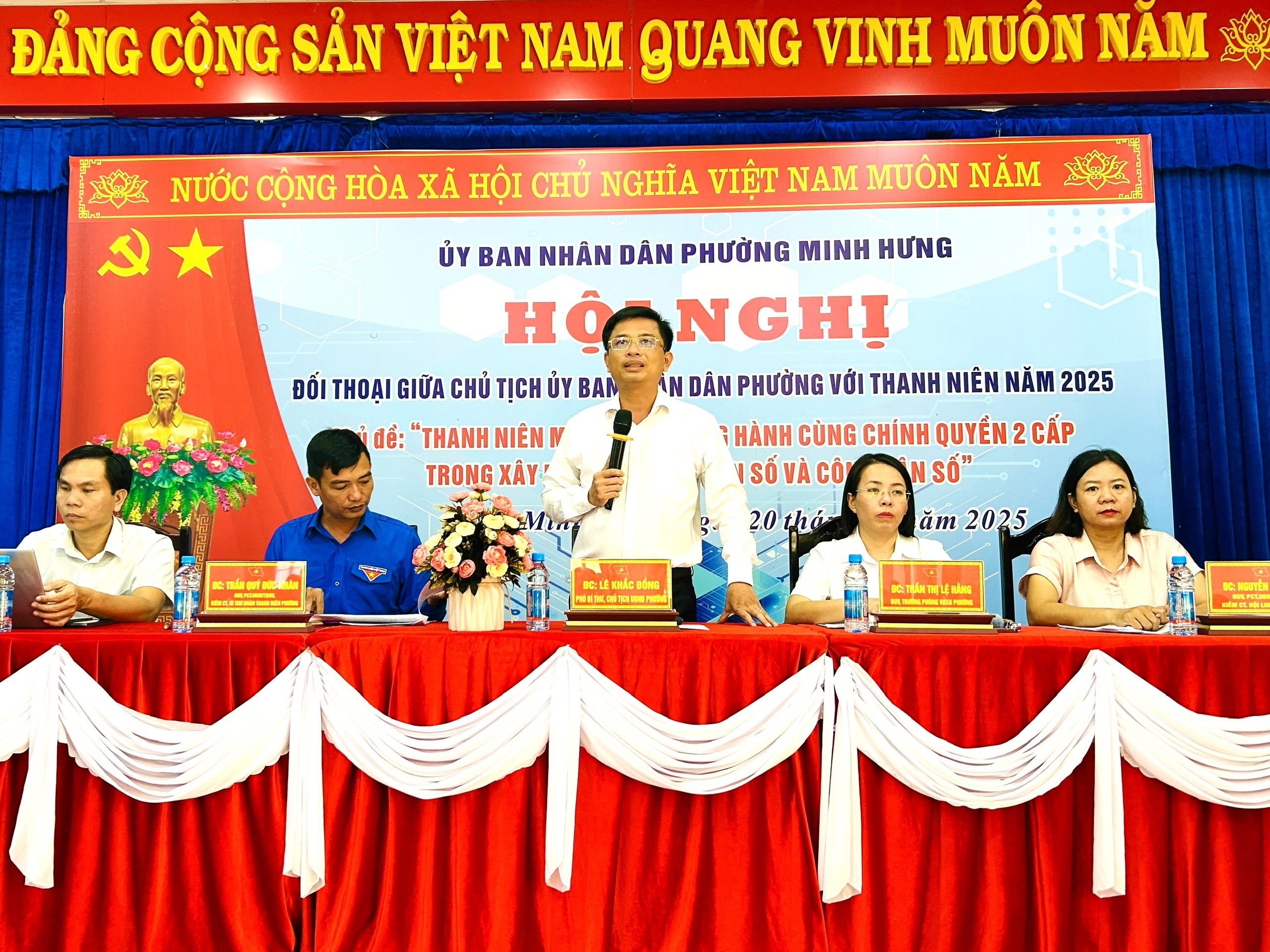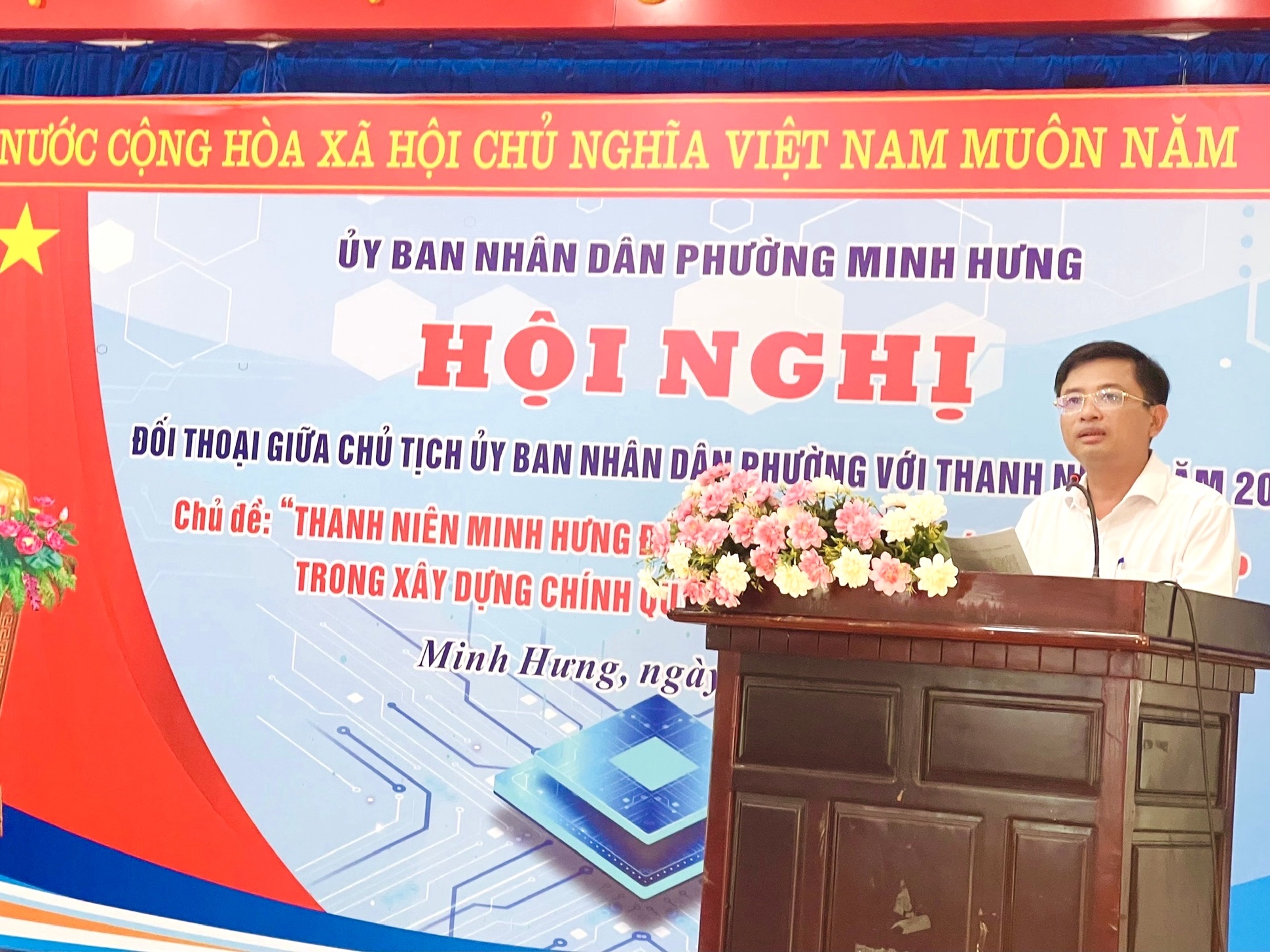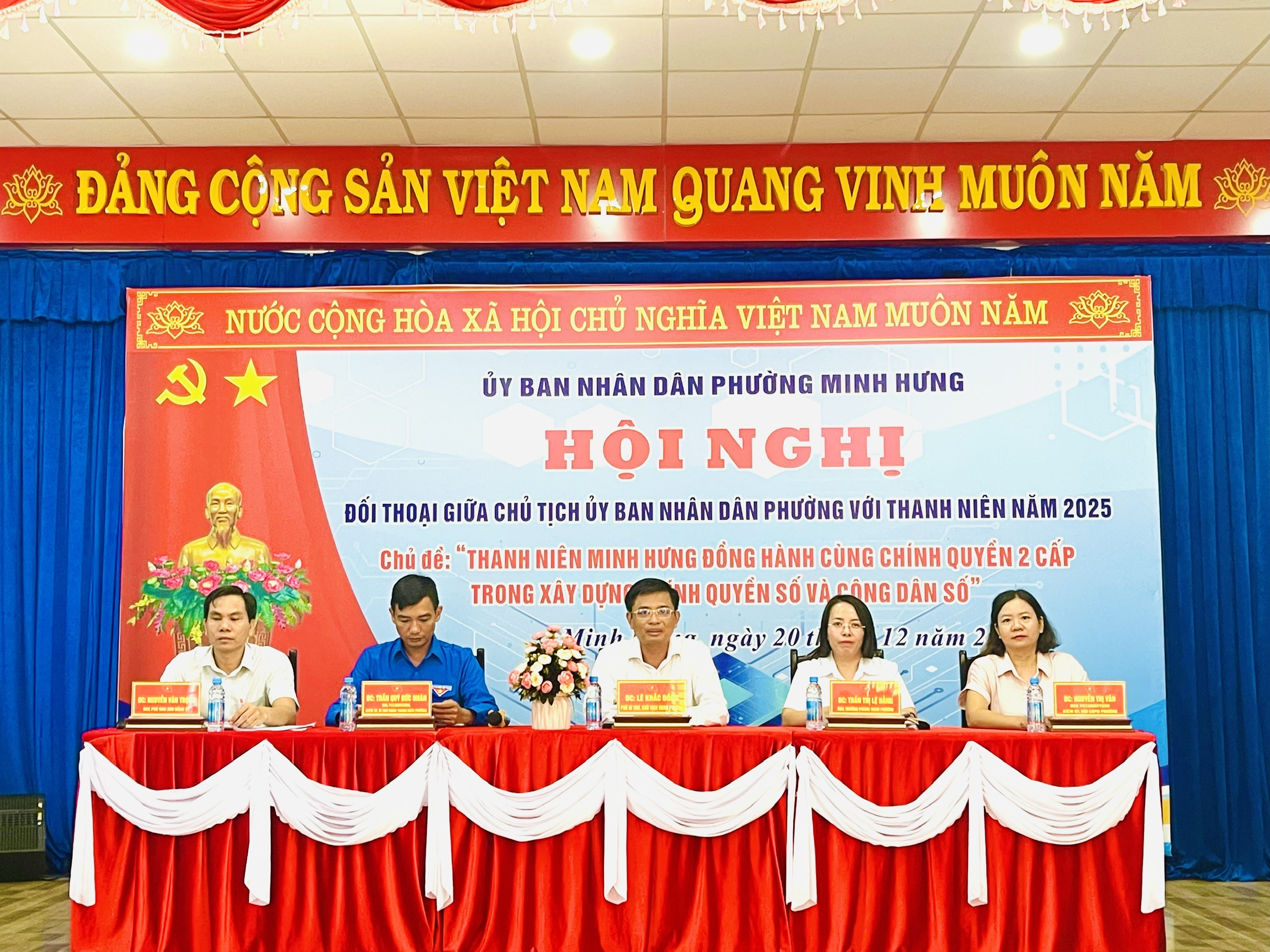 Sáng ngày 20/12/2025, Ủy ban nhân dân phường Minh Hưng tổ chức Hội nghị đối thoại trực tiếp giữa Chủ tịch UBND phường với thanh niên năm 2025, với chủ đề: “Thanh niên Minh Hưng đồng hành cùng chính quyền hai cấp trong xây dựng chính quyền số và công dân số”.