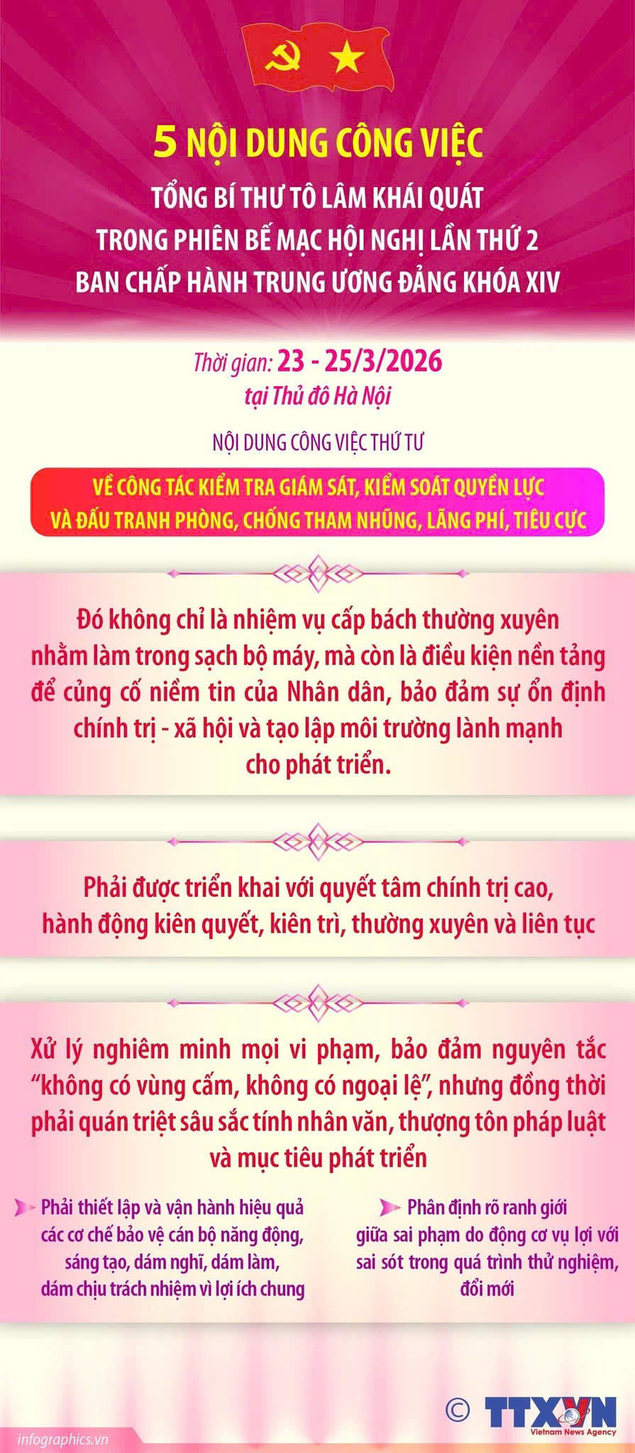 Trong bài phát biểu tại phiên bế mạc Hội nghị lần 2 Ban Chấp hành Trung ương Đảng khóa XIV, Tổng Bí thư Tô Lâm đã khái quát và nhấn mạnh 5 nội dung công việc: Về công tác chính trị, tư tưởng trong Đảng; Về mục tiêu tăng trưởng kinh tế “hai con số”; Về phát huy thế mạnh mô hình chính quyền địa phương 2 cấp; Về công tác kiểm tra giám sát, kiểm soát quyền lực và đấu tranh phòng, chống tham nhũng lãng phí tiêu cực; Về Bảo đảm quốc phòng, an ninh, đối ngoại, hội nhập quốc tế trong giai đoạn mới./.