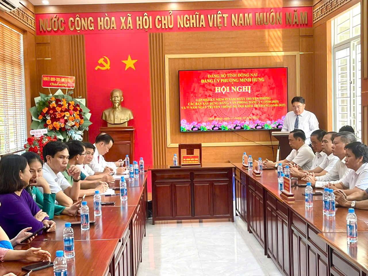 Phát biểu tại buổi họp mặt, đồng chí Đặng Hiếu Thảo - Phó Bí thư thường trực Đảng ủy phường nhấn mạnh: “Công tác xây dựng Đảng và kiểm tra của Đảng là nền tảng vững chắc để giữ gìn sự trong sạch, vững mạnh của tổ chức Đảng, góp phần nâng cao hiệu quả lãnh đạo, chỉ đạo trong toàn hệ thống chính trị. Đồng chí biểu dương những nỗ lực, cống hiến của đội ngũ cán bộ làm công tác xây dựng Đảng, kiểm tra, văn phòng cấp ủy trong thời gian qua. Đồng thời đề nghị các đồng chí tiếp tục phát huy tinh thần trách nhiệm, đoàn kết, đổi mới, sáng tạo, hoàn thành tốt nhiệm vụ tham mưu cho cấp ủy, nâng cao năng lực lãnh đạo và sức chiến đấu của tổ chức cơ sở đảng, góp phần xây dựng tổ chức Đảng ngày càng trong sạch, vững mạnh, đáp ứng yêu cầu nhiệm vụ trong giai đoạn mới. Chúc các đồng chí luôn dồi dào sức khỏe, hạnh phúc và luôn hoàn thành xuất sắc mọi nhiệm vụ được giao, góp phần xây dựng phường Minh Hưng ngày càng phát triển, giàu đẹp ./.