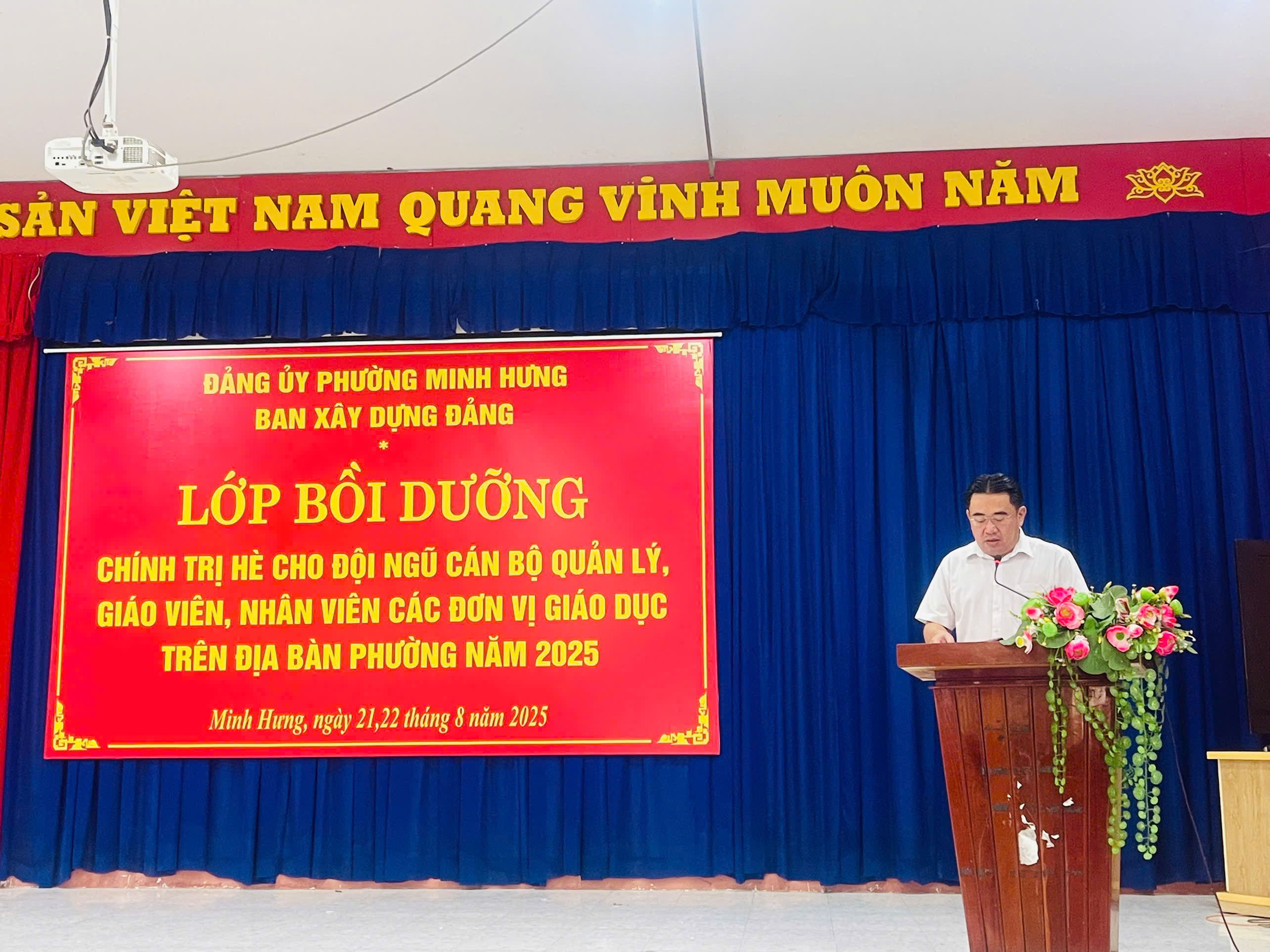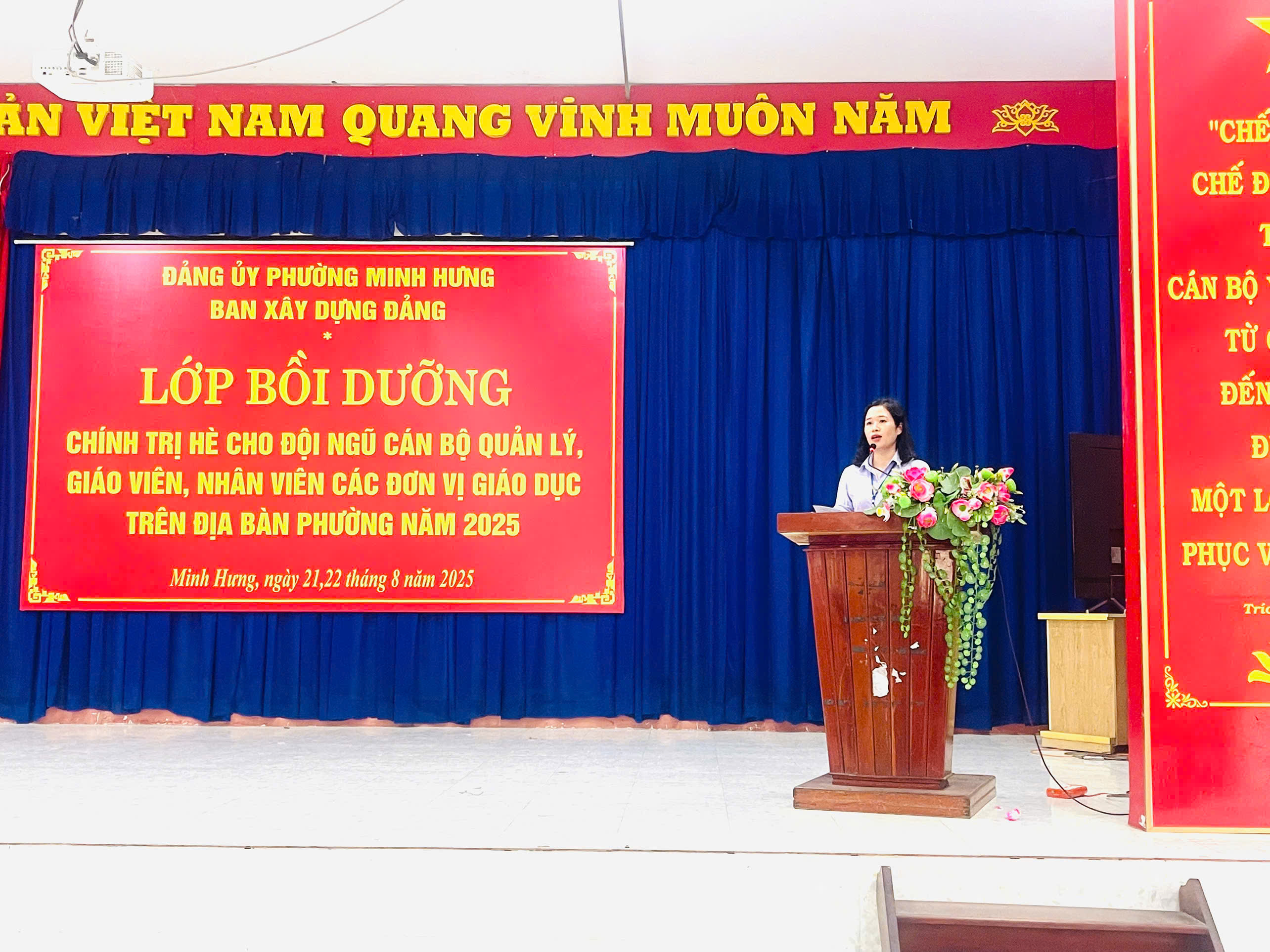 Đợt bồi dưỡng, tập huấn chính trị hè năm nay, cán bộ, giáo viên các trường, nhóm lớp trên địa bàn phường được tập huấn 2 chuyên đề: Chuyên đề 1: Phổ biến, quán triệt chủ trương, chính sách mới của Đảng, Nhà nước về lĩnh vực giáo dục và đào tạo, khoa học, công nghệ, đổi mới sáng tạo và chuyển đổi số; Tình hình quốc tế, trong nước; tình hình kinh tế - xã hội của tỉnh nổi bật 6 tháng đầu năm và nhiệm vụ 6 tháng cuối năm 2025. Chuyên đề 2: Những thành tựu, hạn chế, vấn đề đặt ra trong thực tiễn xây dựng Chủ nghĩa xã hội ở Việt Nam; quan điểm, định hướng, giải pháp tiếp tục đẩy mạnh toàn diện, đồng bộ công cuộc đổi mới, xây dựng, phát triển đất nước trong kỷ nguyên mới của dân tộc Việt Nam; Thông tin nội dung tổng kết Nghị quyết 18-NQ/TW ngày 25/10/2017 về một số vấn đề về tiếp tục đối mới, sắp xếp tổ chức bộ máy của hệ thống chính trị tinh gọn, hoạt động có hiệu lực, hiệu quả.
