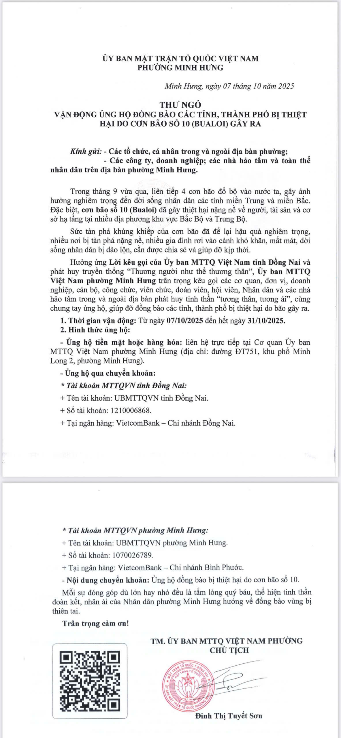 Nhằm đảm bảo công tác tiếp nhận, tổng hợp và chuyển nguồn lực kịp thời đến các tỉnh, thành bị thiệt hại, Ban Thường trực Ủy ban MTTQ Việt Nam phường Minh Hưng chính thức dừng tiếp nhận mọi sự đóng góp, ủng hộ đồng bào khắc phục hậu quả bão số 10 và 11 kể từ 16 giờ 00 phút ngày 30/10/2025 qua MTTQ Việt Nam phường Minh Hưng. Mọi sự đóng góp phát sinh sau thời điểm này, xin gửi trực tiếp về tài khoản của MTTQ Việt Nam tỉnh Đồng Nai: Số tài khoản: 1210006868 – Ngân hàng VietcomBank, Chi nhánh Đồng Nai, thời hạn tiếp nhận: đến 24 giờ 00 phút ngày 31/10/2025.